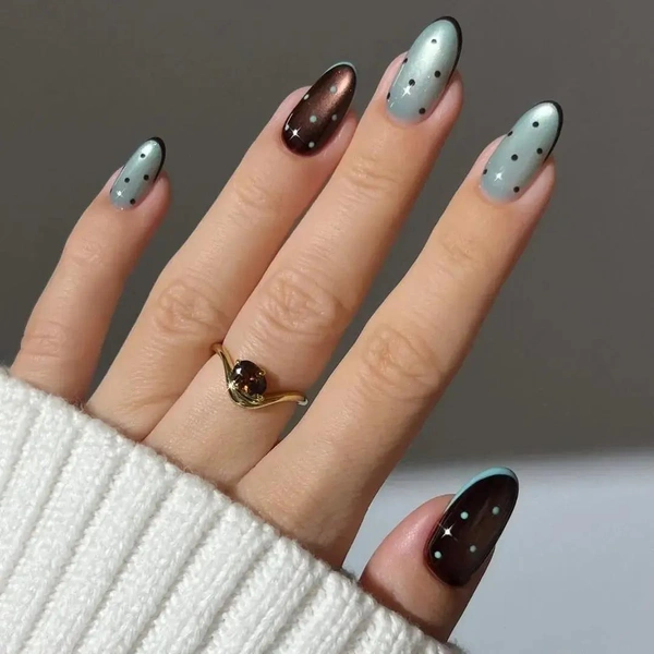 Шоколадный и мятный сочетаются очень круто не только в мороженом, но и на ногтях. Сделай такой маникюр: несколько ногтей покрой светло=зеленым лаком, а другие коричневым. Затем на каждом нарисуй контрастные точки и микрофренч. Готово! Этот дизайн легко повторить, а смотрится он круто на ногтях любой длины.