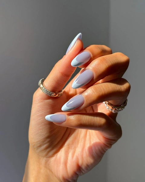 В этом маникюре очень похожее сочетание, только тут должны быть не только разные оттенки, но и разные текстуры. В качестве базы выбирай голубой желейный лак, сквозь который просвечивает кончик даже после нескольких слоев. А кончик покрывай плотным лаком другого оттенка. Хорошо работают комбинации пастельного цвета и более темного.