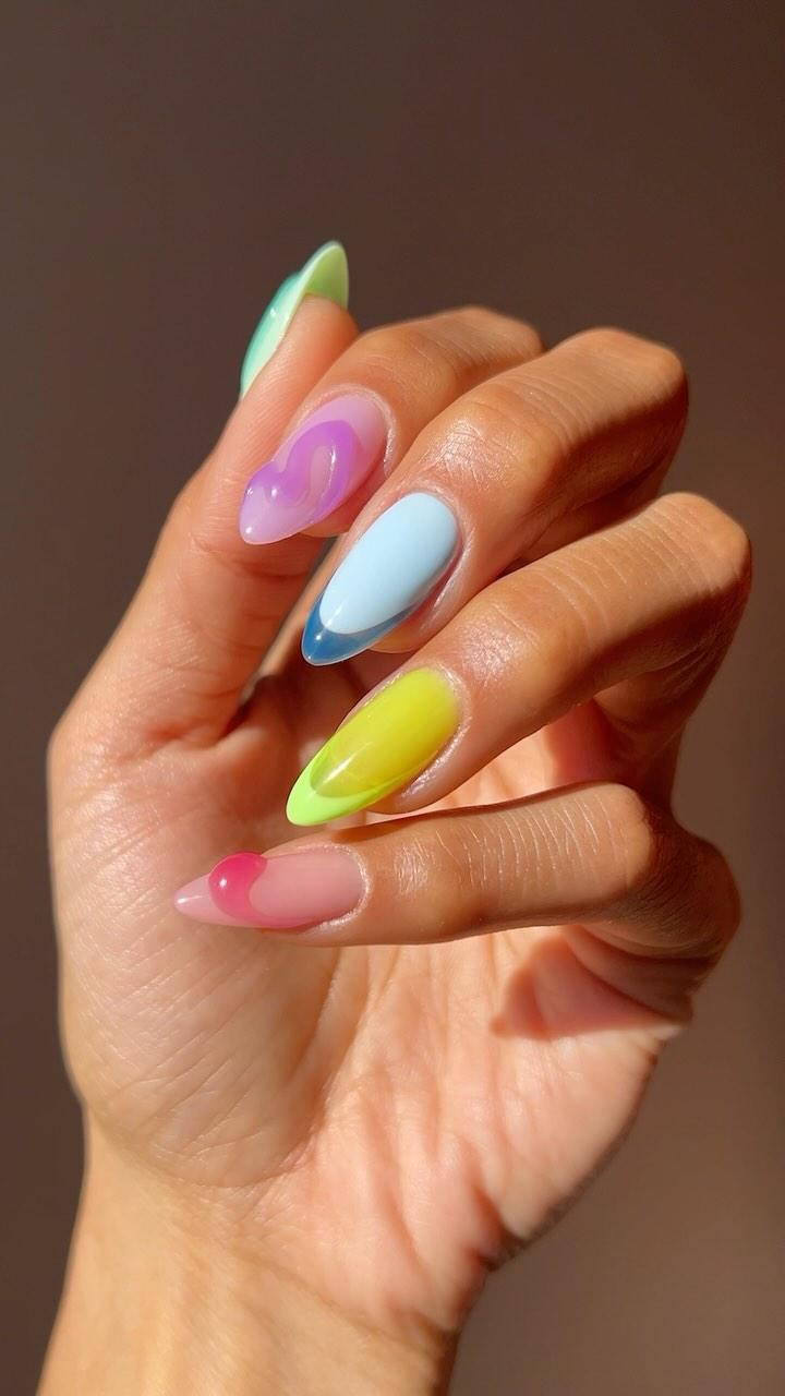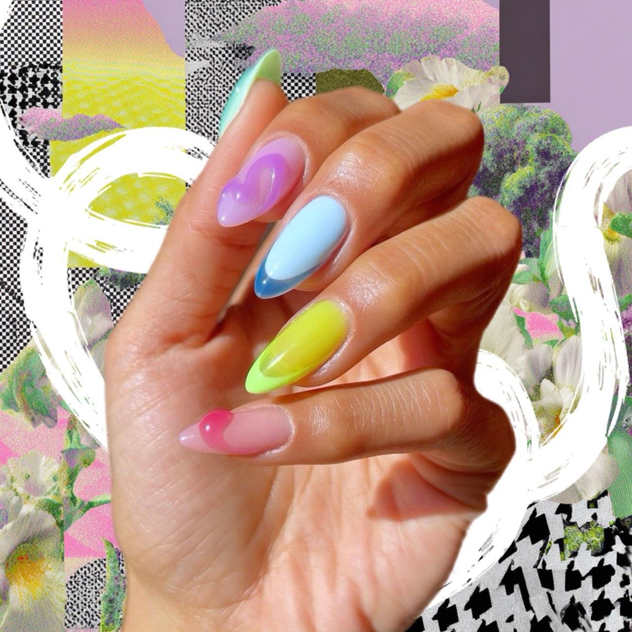 Один из самых трендовых вариантов весны 2026 — маникюр с инверсией. Если обычно в качестве базы выбирают более прозрачную текстуру, а для кончиков плотную, то тут все наоборот. Все ногти покрыты непрозрачный цветом, а френч нарисован желейным лаком. Цвета выбирай любые, но лучше всего смотрятся неоновые и пастельные.