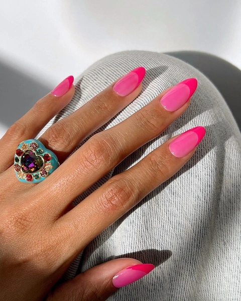 В этом маникюре используются два похожих цвета — разные оттенки розового. В качестве базы выбирай яркий, но не очень насыщенный лак. Он станет красивой основой для любого цветного маникюра, но в сочетании с более сочными кончиками точно будет выглядеть эффектнее. Френч нарисуй более глубоким лаком. Получится очень необычно, но красиво!