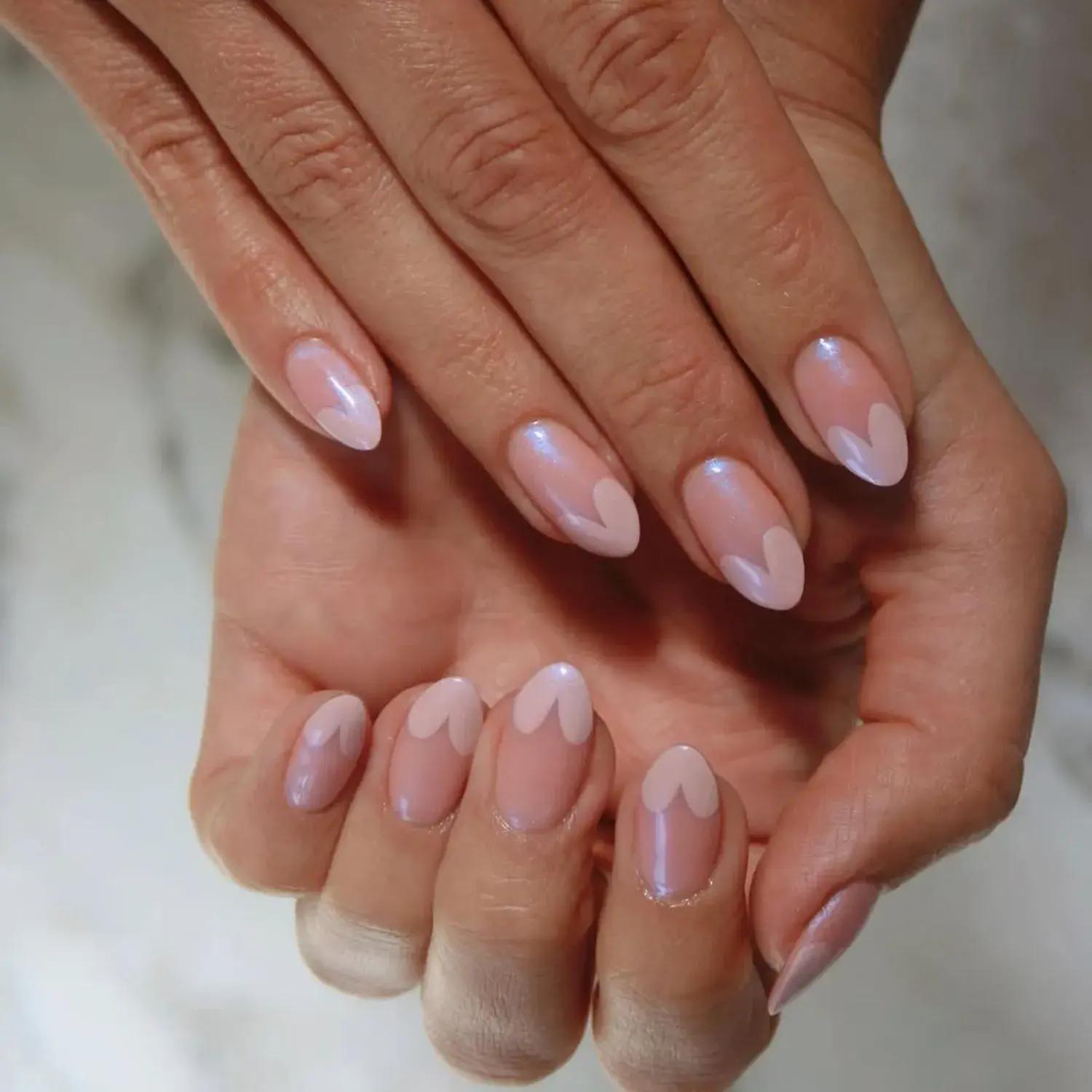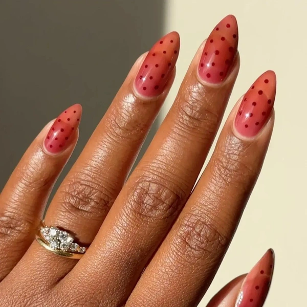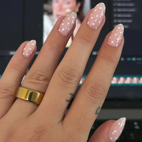 Этот дизайн вызывает ассоциации с балетными колготками из детства. В его основе лежит розовато-нюдовая база — полупрозрачная, почти фарфоровая. Аккуратный горошек делает маникюр чуть более игривым. Он выглядит легко и свежо, не перегружая руки деталями. Отличный вариант для тех, кто хочет попробовать тренд, но предпочитает светлую палитру и мягкие акценты.
