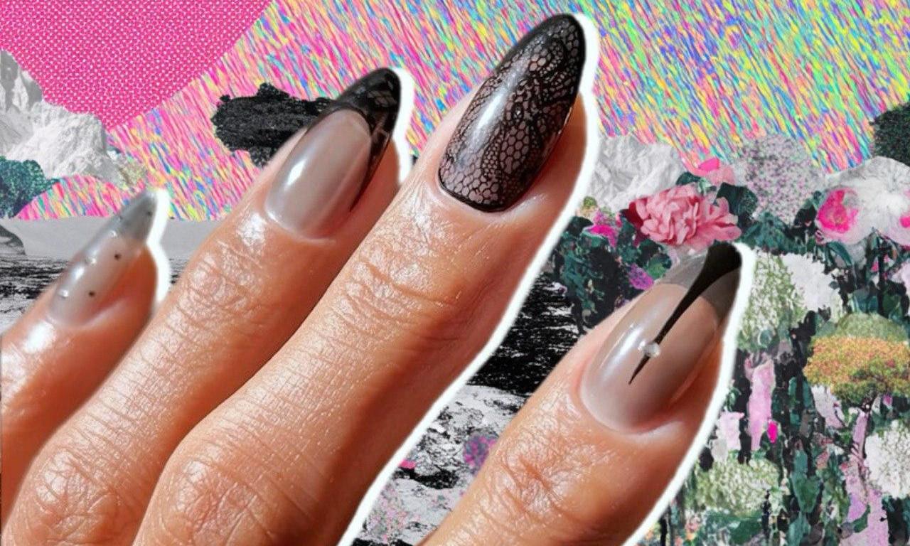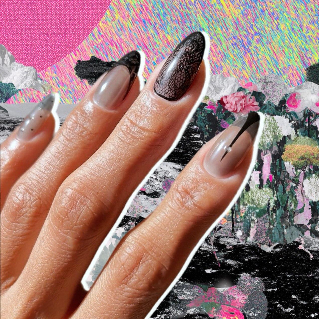 Вот настоящая ода чулочной моде. Здесь есть все: кружево, горошек, тонкие черные акценты, сложные слои, френч и даже стразы. Маникюр выглядит как полноценное украшение рук и легко может стать центральной деталью образа. Он требует уверенности и минимализма в остальном — выбирай простой наряд и нюдовый макияж.