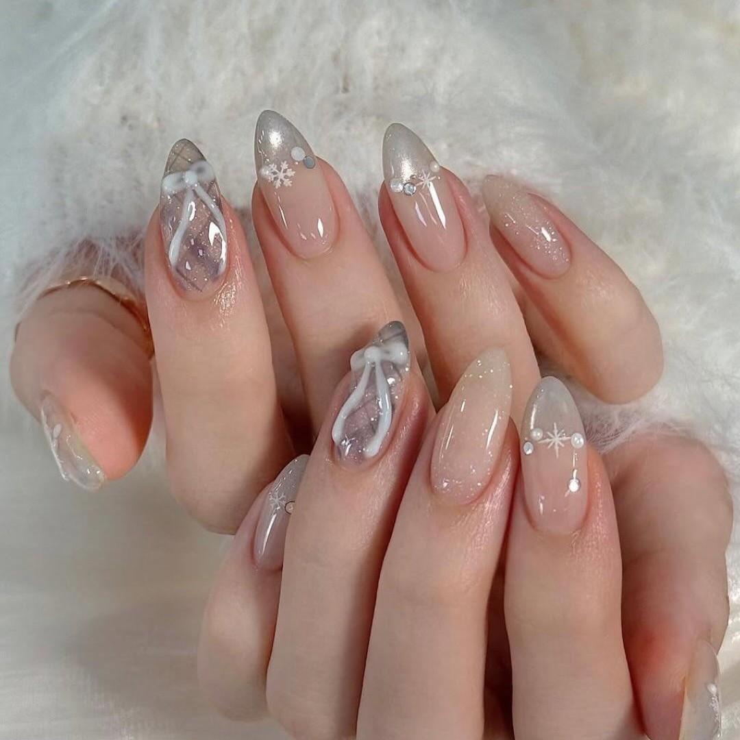 Светло-серый цвет смотрится не хуже молочного в зимнем маникюре. Скомбинируй их! Серые ноготки оставь без дизайна, только с глянцевым топом. А на белых уже сделай нейл-арт. Предлагаю градиентный френч из серебристого шиммера с белыми снежинками и классическими стразами. А если любишь объемные маникюры, то рисуй бантики в сером цвете с блестками.