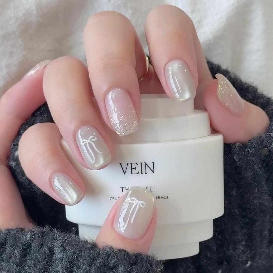 Лови еще один вариант маникюра с шелковым «кошачьим глазом». Цвет лака тоже пусть будет светлым — серебристым, холодным бежевым, нюдовым, цвета слоновой кости, серым. На некоторых ноготках нарисуй белые изящные бантики. А еще на паре ногтей пусть будет акцент с шиммером. Например, сделай френч из блесток в градиентном виде.