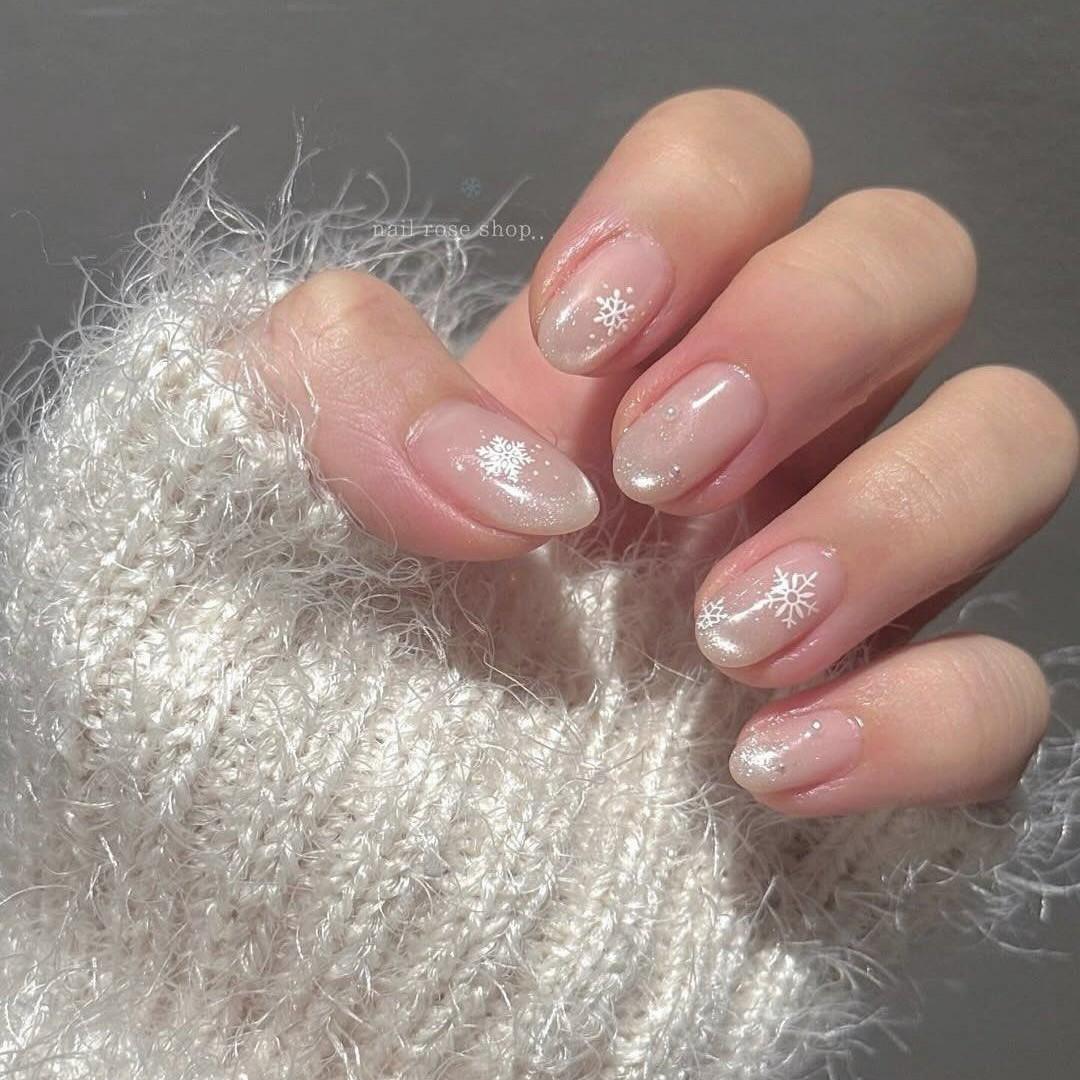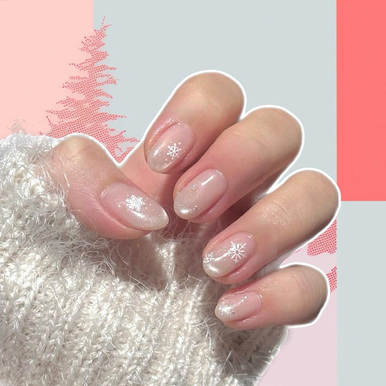 Этот маникюр выглядит очень минималистично и в хорошем смысле просто. Сделать его легко! Первый шаг — база в нюдовой гамме. Выбирай розовый, телесный, молочный или любой другой прохладный оттенок. Затем на кончиках сделай градиент лаком с эффектом «кошачий глаз». Цвет должен быть серебристым, почти прозрачным. Не забудь обработать ногти магнитом! А потом укрась пальчики белыми снежинками и жемчужными стразами.