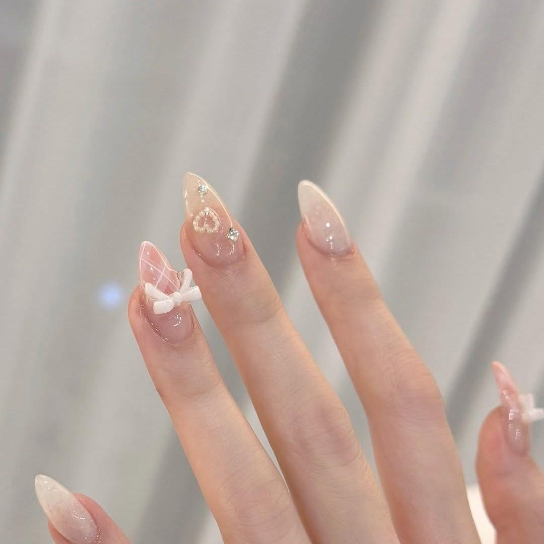 Ну а если ты не любишь цветные маникюры, но при этом не против объемных дизайнов, то этот вариант для тебя. В качестве базы используй светлый молочный лак с блестками. А уже поверх размещай фигурки в виде бантиков, жемчужных сердечек или стразы. Если хочется сделать и рисунок, то розово-белые полоски на кончиках будут выглядеть классно.