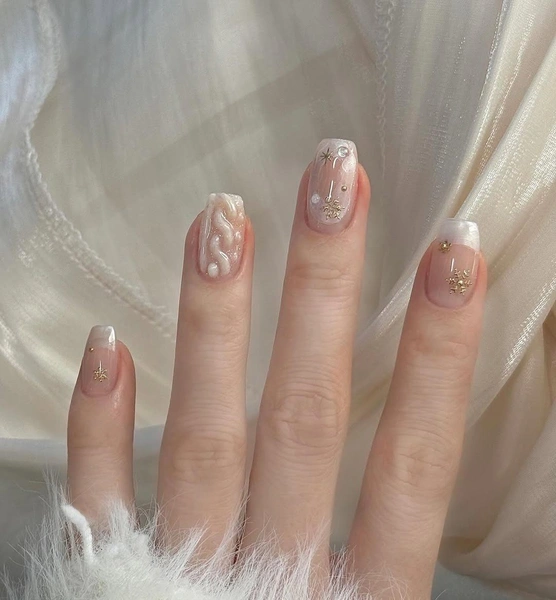 В этом маникюре сделай главный акцент на одном ногте, который укрась объемным вязаным дизайном. Сделать его несложно, но времени он займет немало: сначала покрой ноготь молочным лаком с блестками, а потом вылепи из геля-пластилина текстуру вязания. На остальных ноготках сделай бело-перламутровый френч. Такие пальчики можно задекорировать бульонками, стразами и наклейками в виде снежинок золотого цвета.