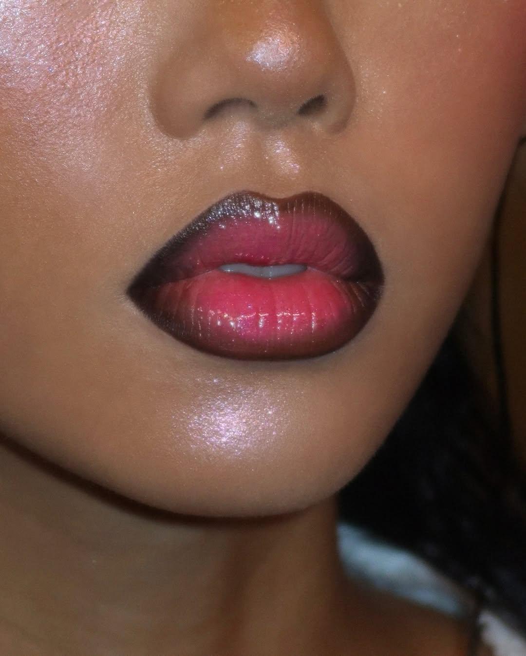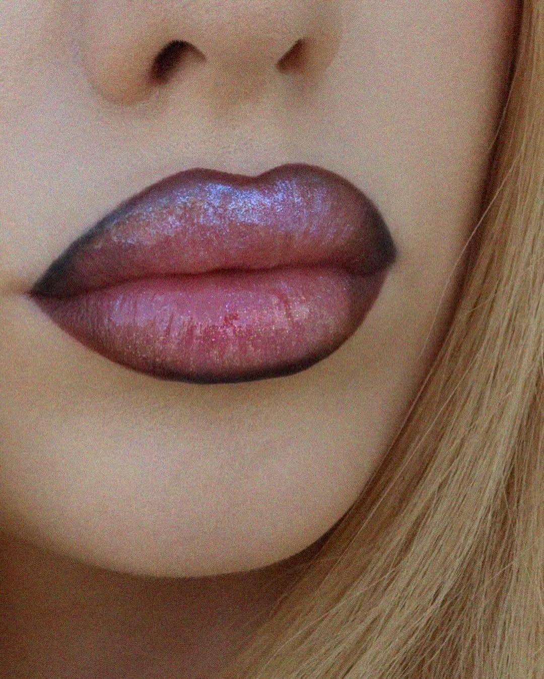 Градиентный контур губ всегда смотрится невероятно. Что сочетать в нем? В качестве основного цвета выбирай темный коричневый, а уголки и середину нижней губы затемни почти черным цветом. Всю поверхность губ покрой блеском с шиммером — готово! Такая деталь точно станет главным акцентом в любом макияже.