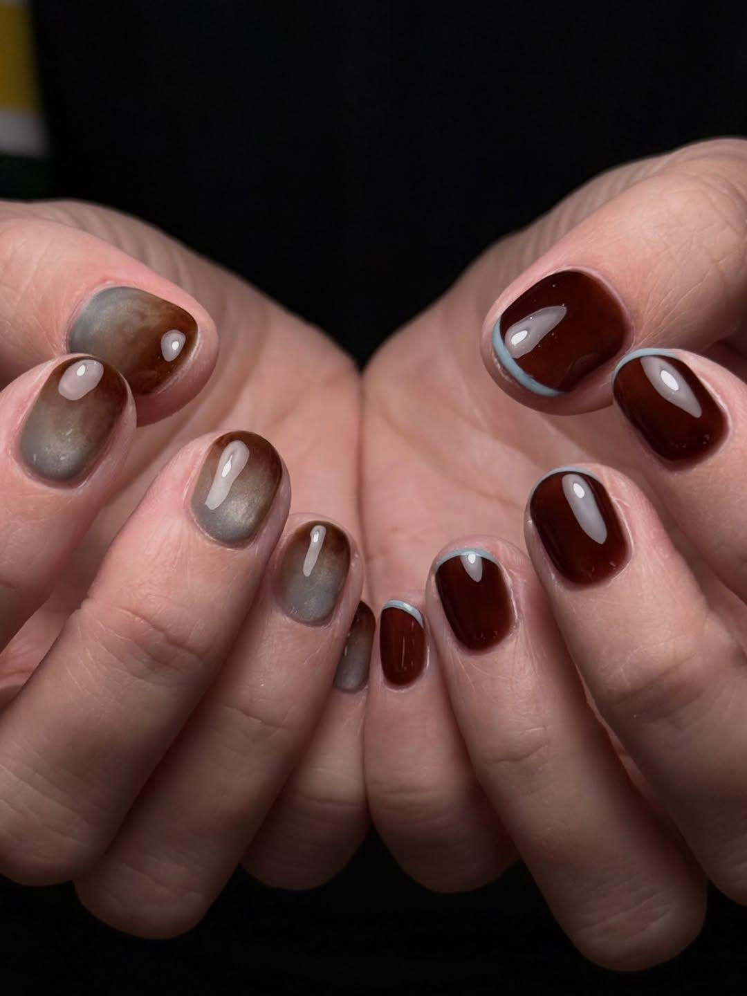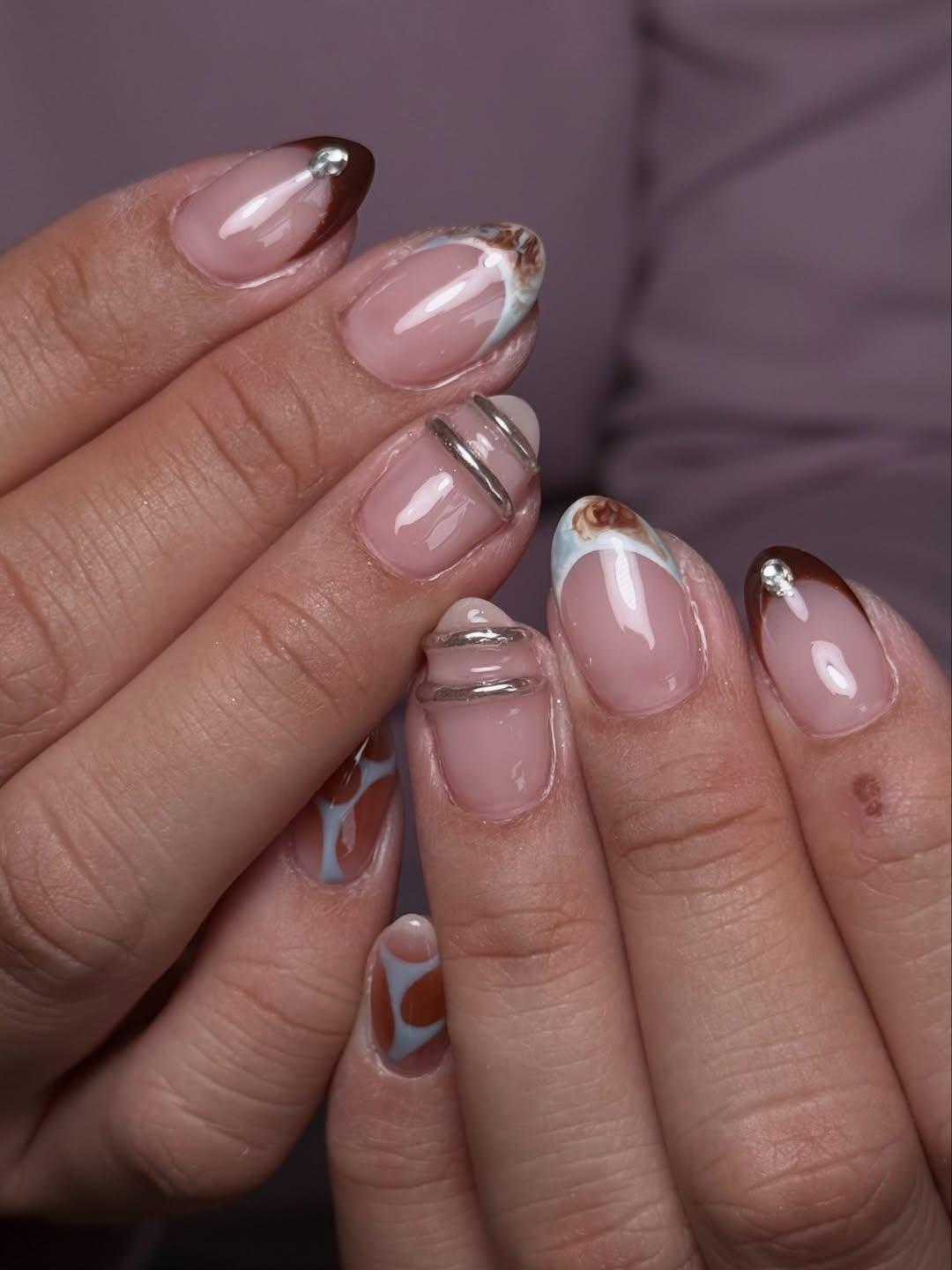 В этом маникюре красиво сочетаются сразу два вида френча. Первый — симпатичный, но простой маникюр коричневого цвета. Его очень просто сделать, а украсить ногти можно стразами. А второй дизайн — мраморный френч. Сначала сделай голубую основу, а потом покрой ее коричневыми разводами.