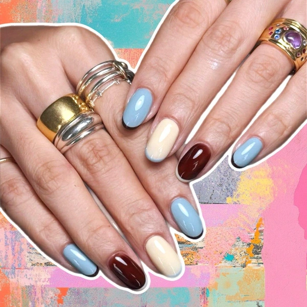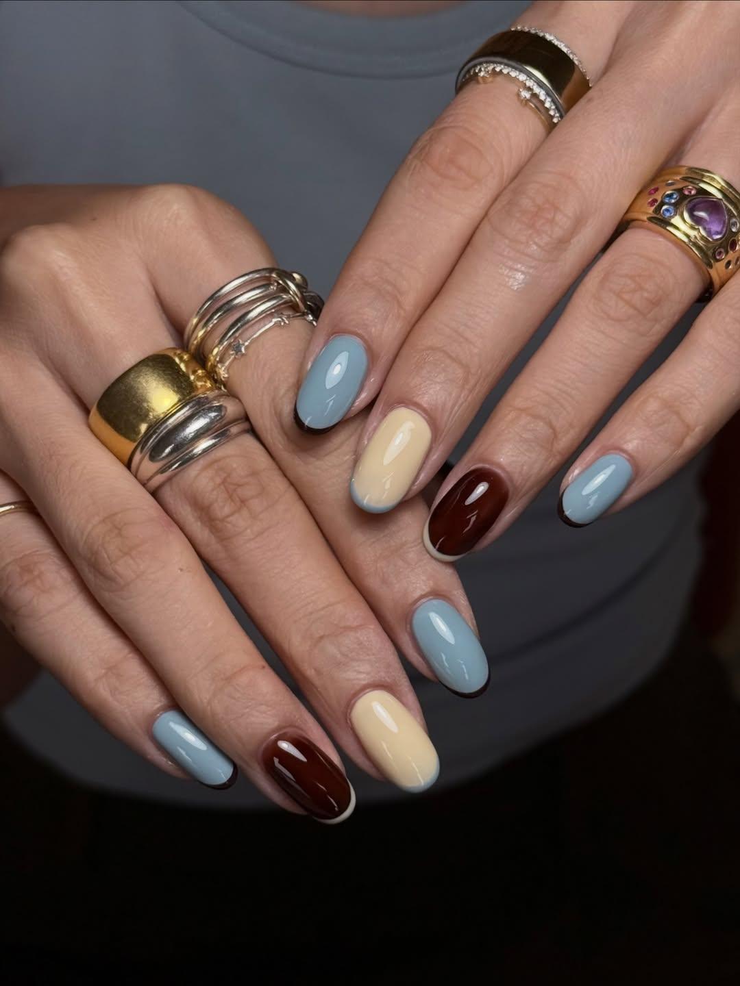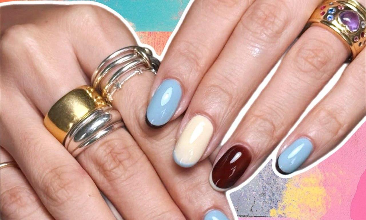 Для этого маникюра тебе нужны всего три лака — голубой, сливочно-желтый и бордовый. Накрась ими ногти, чередуя оттенки. А потом рисуй френч тонкой кисточкой. На самых темных ногтях пусть будет самый светлый и наоборот. Такой маникюр будет выглядеть очень необычно, несмотря на свою простоту!
