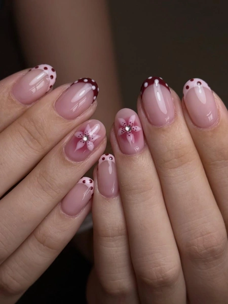 В этом маникюре все просто! Тебе нужны розовый и бордовый лак. Сделай френч в обоих оттенках, а потом на каждом поставь точки-горошины контрастным оттенком. Дизайн готов 💅