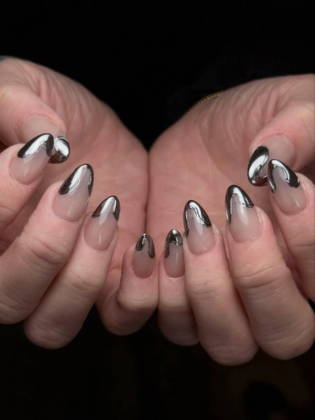 Френч может быть не только не белым, но и не полукруглым. Очень стильно выглядит волнистый маникюр, который будто бы плавится на твоих ногтях. Используй для него серебряный или золотой лак, чтобы ногти выглядели эффектнее.