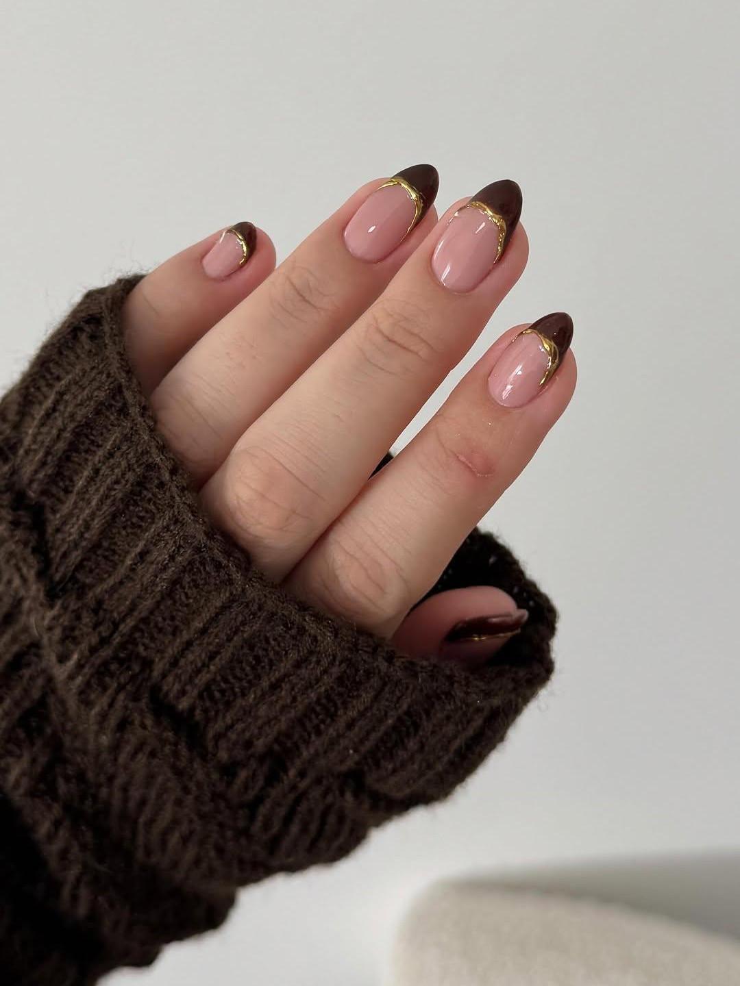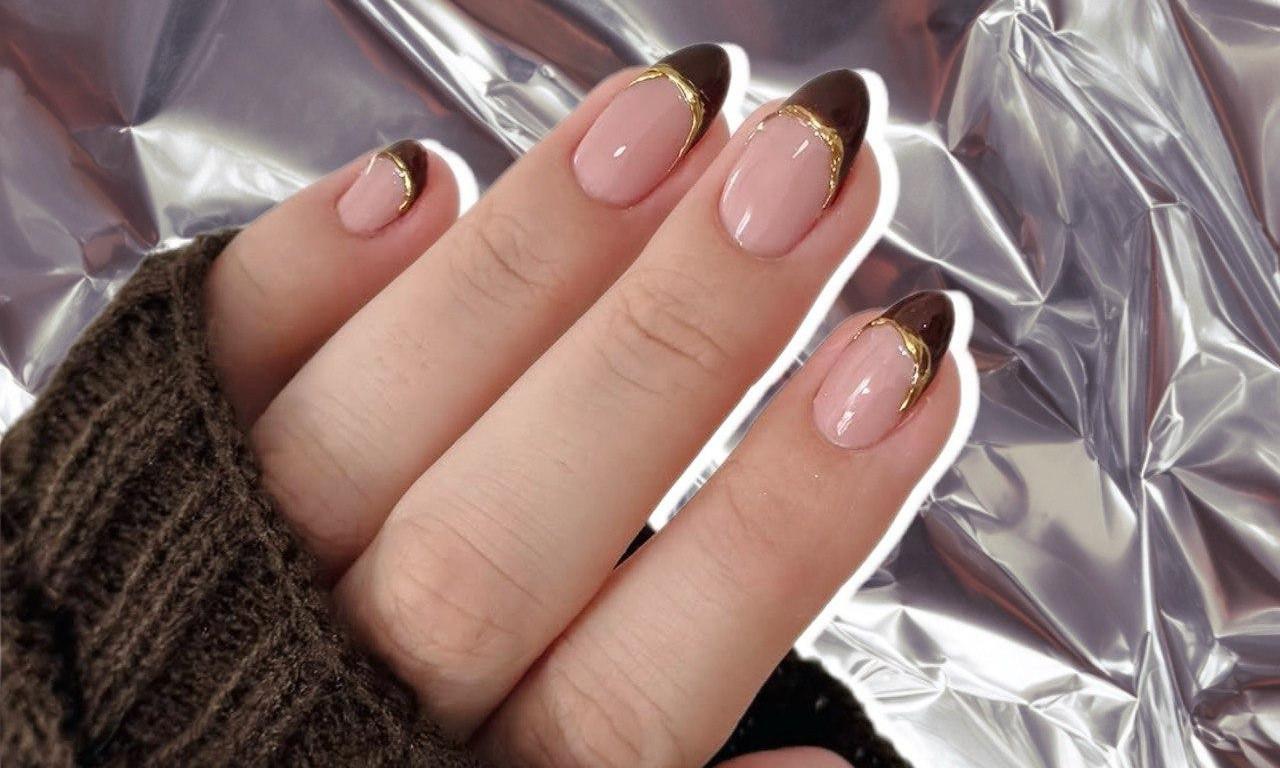 Коричневый в сочетании с золотыми акцентами выглядит максимально дорого и роскошно. Такой френч понравится тем, кто устал от холодных оттенков и хочет тепла и уюта. Линия улыбки в таком маникюре может быть шоколадной или кофейной, а золото размести на ней в виде тонкой окантовки. Если захочется чего-то более необычного, то сделай блестящую полоску объемной с помощью геля.