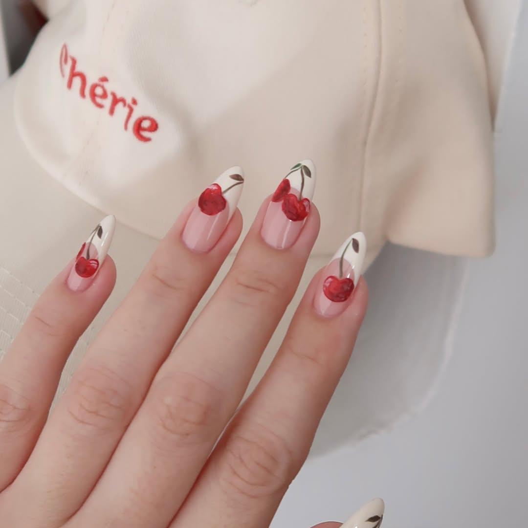 Френч с миниатюрными вишнями — это самое настоящее кокетство. Сначала сделай классический френч: нежная база с полупрозрачным телесным оттенком и светлые кончики. Только для линии улыбки советую выбрать лак цвета слоновой кости, а не обычный белый. Затем на каждом ногте нарисуй крупные вишни с веточками и листиками. Готово! Заверши дизайн глянцевым топом.