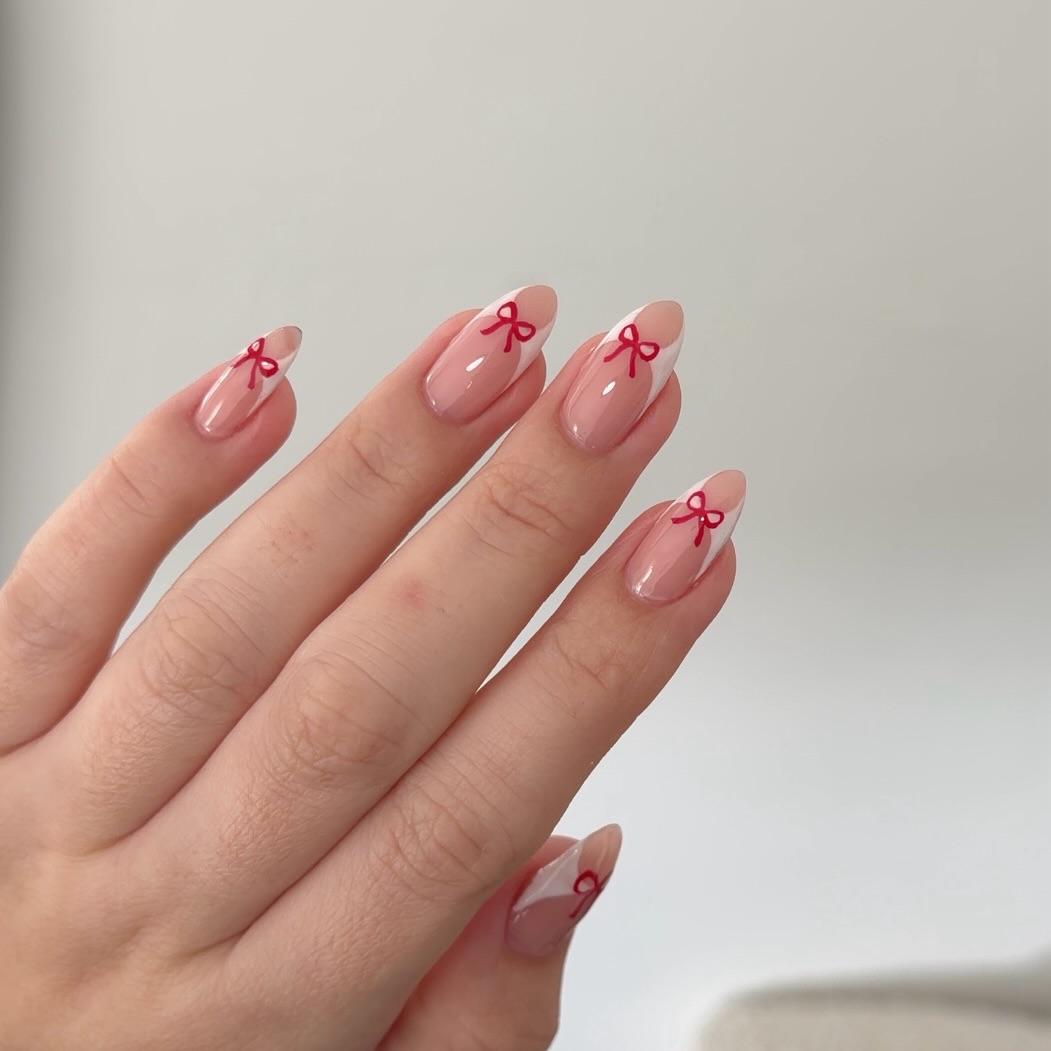 Бантики в маникюре — один из самых заметных трендов последних сезонов, и френч с ними тоже смотрится очень классно. Миниатюрные банты на линии улыбки или рядом с ней делают дизайн изящным. А если сам французский маникюр нарисуешь с модным эффектом негативного пространства, то получится еще круче.