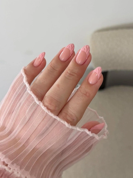 Думаю, самый зимний маникюр выглядит именно так. Вязаный розовый френч — это очень уютный дизайн. Базу выбирай молочную или полупрозрачную нюдовую, а линию улыбки закрашивай пудровым оттенком. Добавь сверху дизайн в виде рельефной текстуры, имитирующей вязку. Такой дизайн выглядит особенно эффектно на миндалевидных или мягких квадратных ногтях.