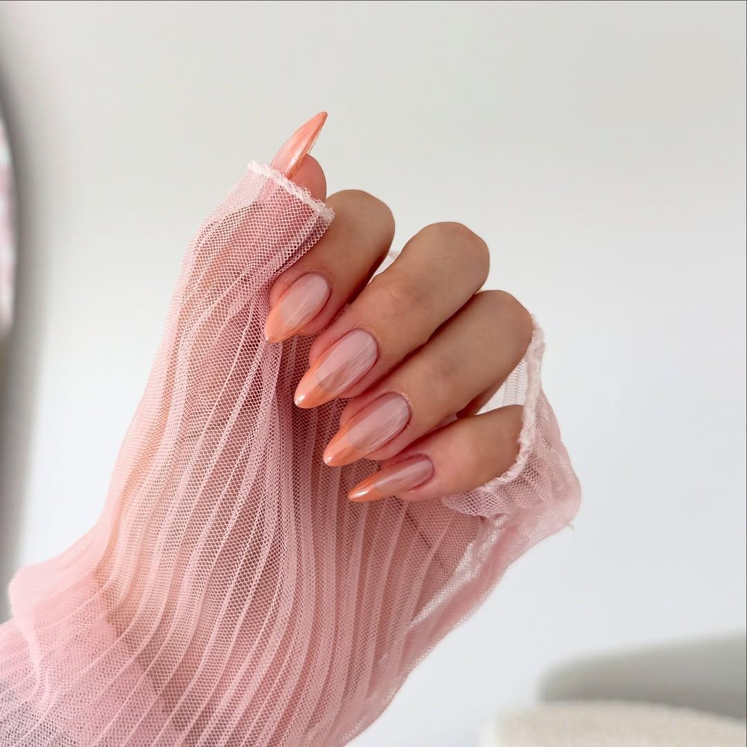 Оранжевый френч с жемчужным сияние выглядит как зимнее солнце, которое все-таки пробилось сквозь серость. Оттенок выбирай мягкий, ближе к мандариновому или абрикосовому. А перламутровый блеск придай с помощью втирки поверх яркого френча. Этот вариант особенно хорош для тех, кто хочет цвета, но боится переборщить.