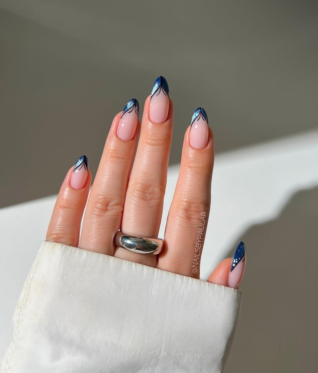 Классические френчи уже не так интересны, как пару лет назад: бьюти-индустрия буквально кипит от огромного количества крутых идей. Например, в виде бабочки, которая напоминает нам о весенних деньках и согревающем солнце. Повторить такой маникюр достаточно просто: вооружись тонкой кистью и блестящим синим лаком. Прорисуй несколько линий к центру края ногтя и добавь небольшие усики, осталось лишь добавить яркого лазурного оттенка!