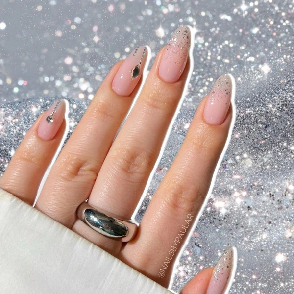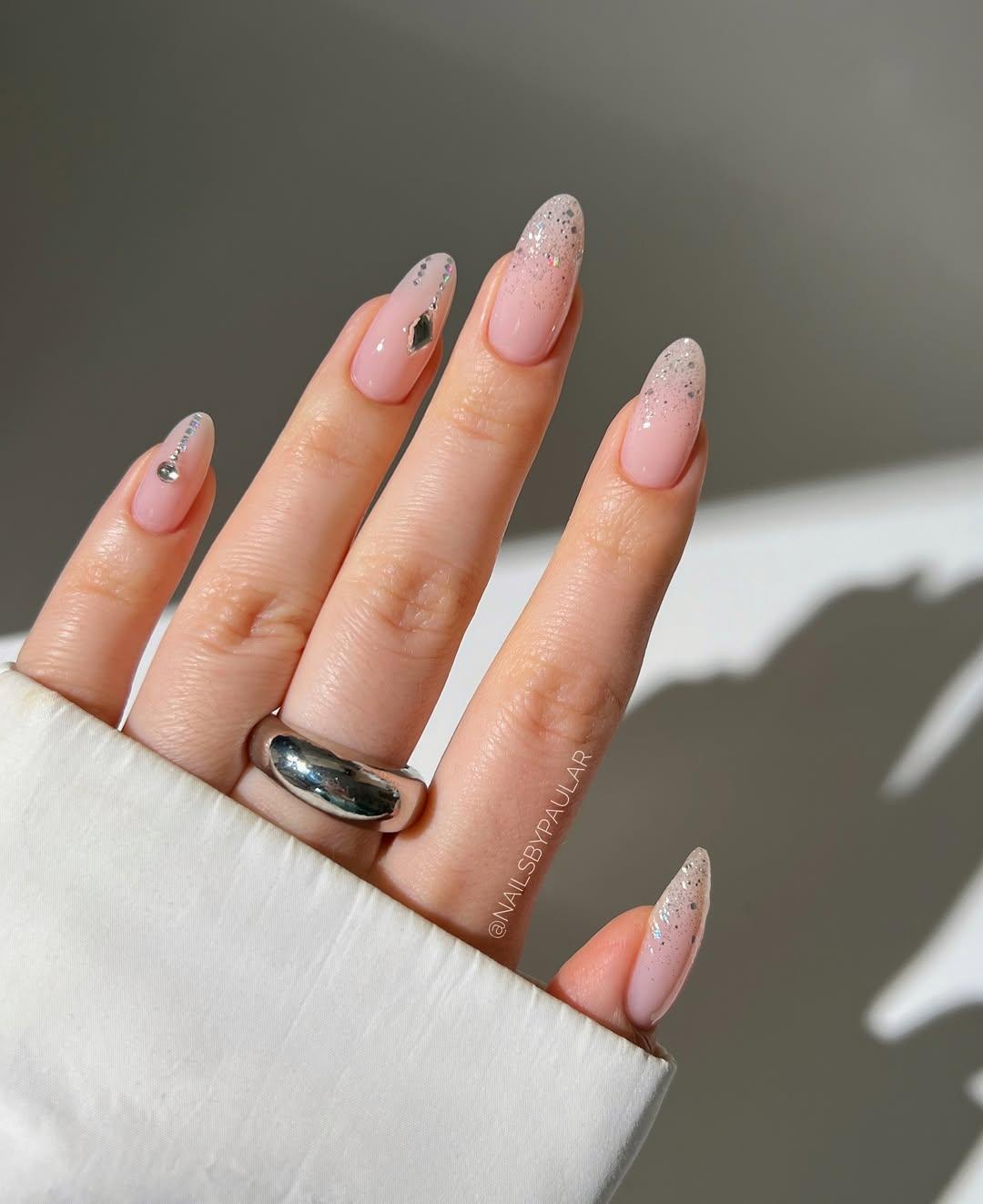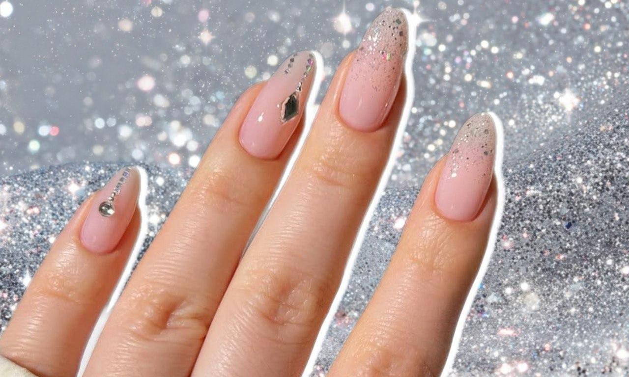 Куда же без любимого базового нюда? Ты можешь отказываться от него в течение нескольких сезонов, но все равно будешь возвращаться, как к тому самому главному бывшему. Покрой ногти классическим бежевым, а уже потом приступи к сияющим акцентам. На большинство ноготков их можно добавить прозрачным лаком с блестками. На другие — крупные и мелкие стразы, чтобы создать игривый контраст.