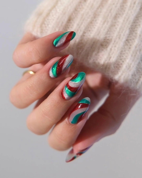 Новогоднее настроение никак не хочет отпускать, даже когда в нейл-артах мы все уже перепробовали все, что возможно. Но видела ли ты маникюр в виде леденца, который часто можно встретить в новогодних подарках? Я предлагаю тебе повторить его с минимальными затратами. Просто вооружись сияющим зеленым, красным и серебряным лаком — самыми актуальными цветами этой зимы, между прочим! Возьми тонкую кисть и рисуй плавные кривые линии в разных направлениях. Осталось лишь любоваться своими «конфетными» ноготками!