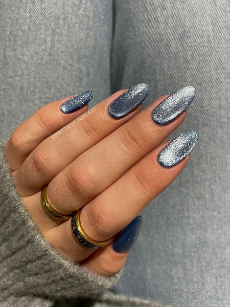 Ты можешь наблюдать за красивыми северным сиянием в Интернете, но даже не подозревать, что его можно повторить в твоем дизайне. Особенно, в глубоком синем оттенке! Весь секрет в эффекте «кошачий глаз»: тебе нужно «осветлить» каждый ноготь полностью, чтобы добиться блестящего серебряного полотна. В самом конце добавь лазурный топ, будто ты саморучно создаешь ночное небо в своем маникюре!