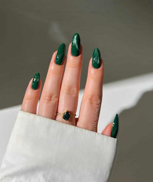 Темно-зеленый — один из самых трендовых цветов 2026 года. Если ты любишь более глубокие оттенки, смело повторяй эту идею самостоятельно. Тем более, инструкция достаточно легкая: чтобы создать такие резкие сияющие переходы, тебе понадобится простая нитка. Ее нужно «пропитать» блестящим салатовым и прозрачным лаком — аккуратно потяни ее за край, чтобы оставить следы на ногтях. Пару бликов магнитом для «кошачьего глаза», и твой загадочный маникюр готов!