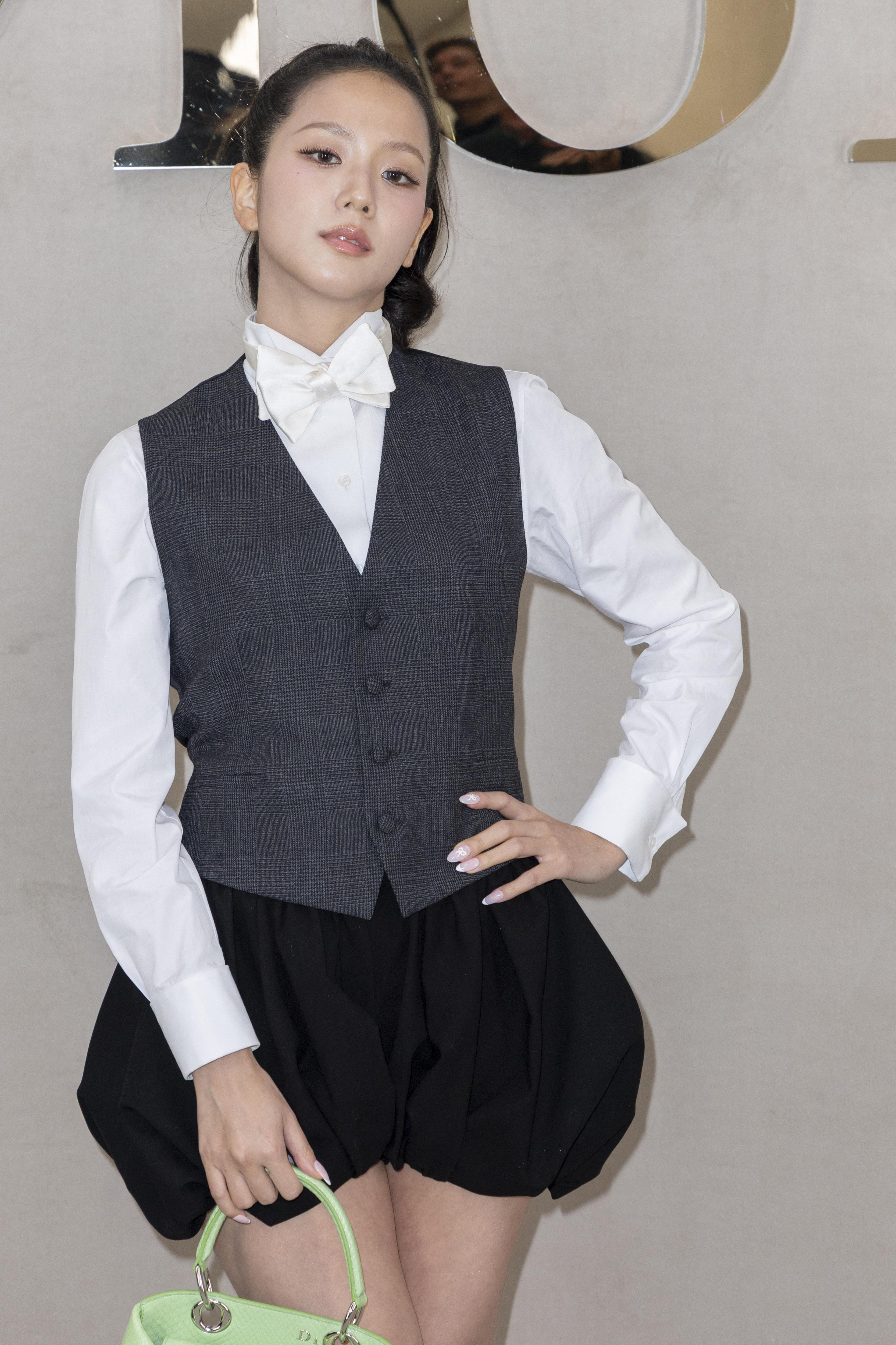 Джису из BLACKPINK пришла на показ Dior в милом деловом луке. Короткая юбка-баллон в черном цвете прекрасно сочеталась с серым жилетом и белой блузкой. Бантик на шее сделал образ более игривым. А зеленая сумочка добавила немного цвета.