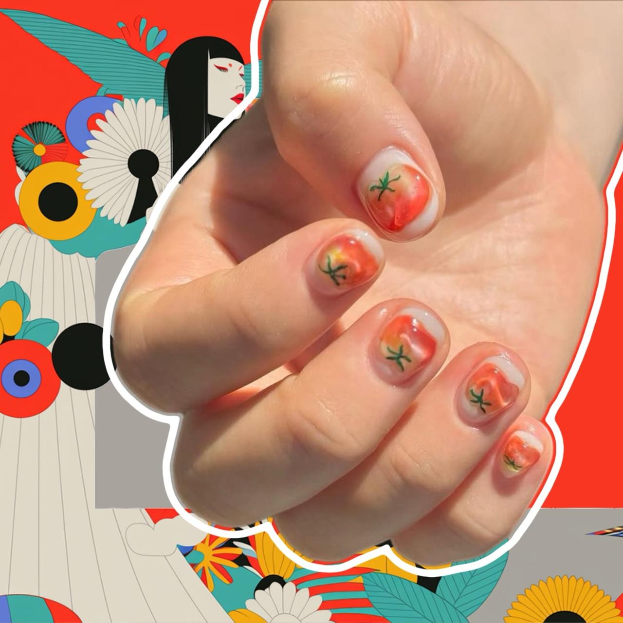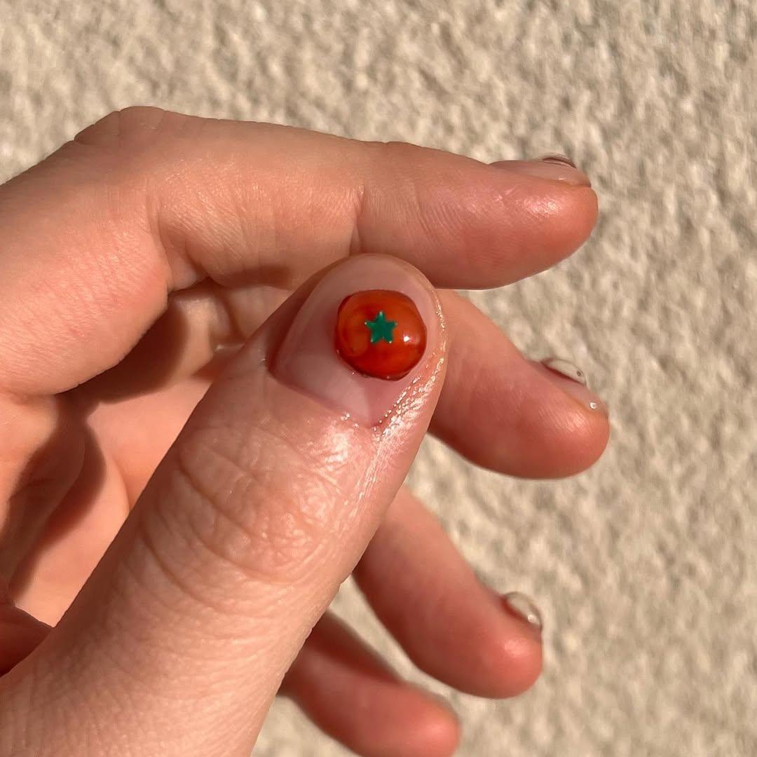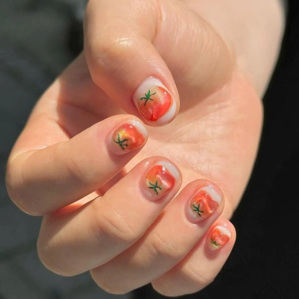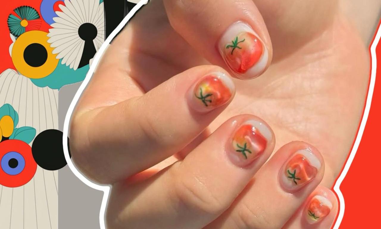 Молочная база с яркими помидорками давно стала классикой. В этом маникюре можно поиграть с цветом томатов — сделать их градиентными, например. И не забудь про листики или плодоножки, чтобы дизайн был реалистичнее.