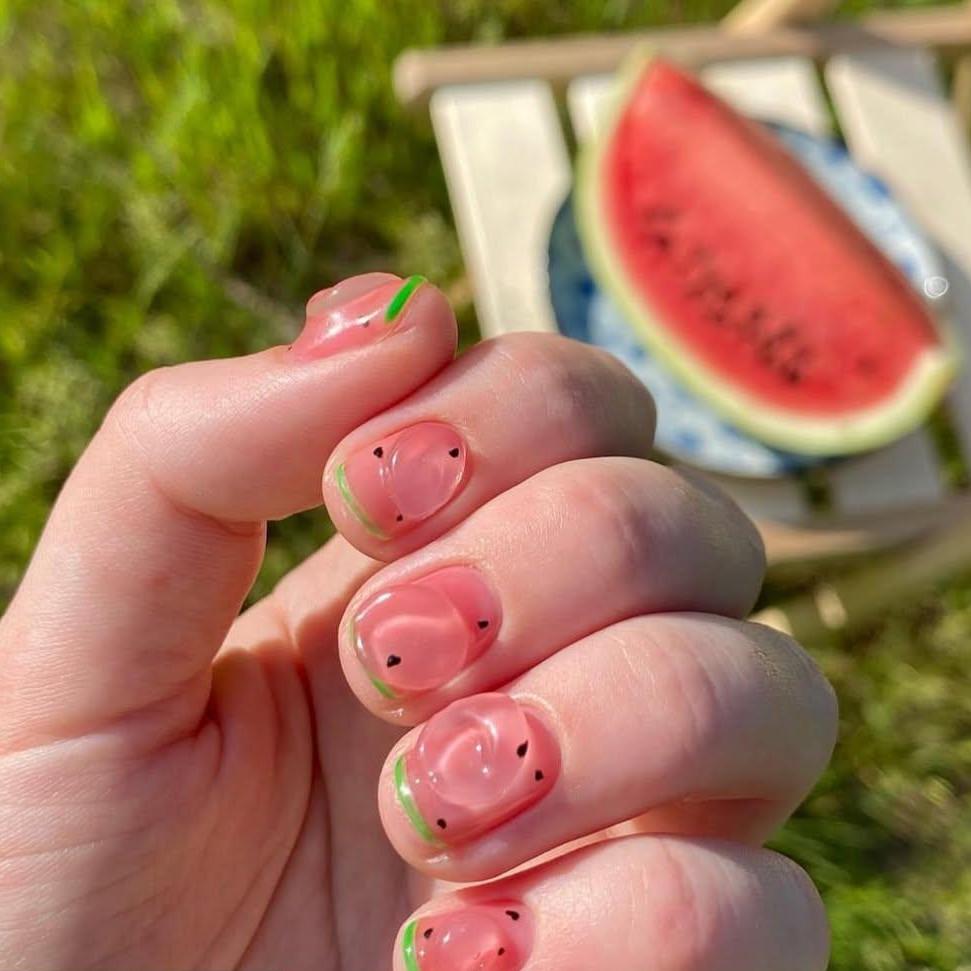Мне кажется, арбузом вдохновляться проще всего. Он сам подсказывает, каким должен быть маникюр. Покрой ногти розовой базой, потом нарисуй полукруглый светло-зеленый френч. Укрась маникюр черными точками-семечками и добавь объема гелем. Готово!