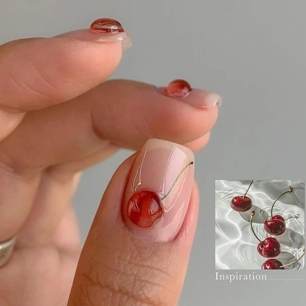 Самый простой маникюр! Покрой ногти прозрачной базой, потом нарисуй прозрачным объемным гелем шарики, затем окрась из красным и нарисуй зеленые плодоножки. Получится очень необычный, но при этом очень милый маникюр.