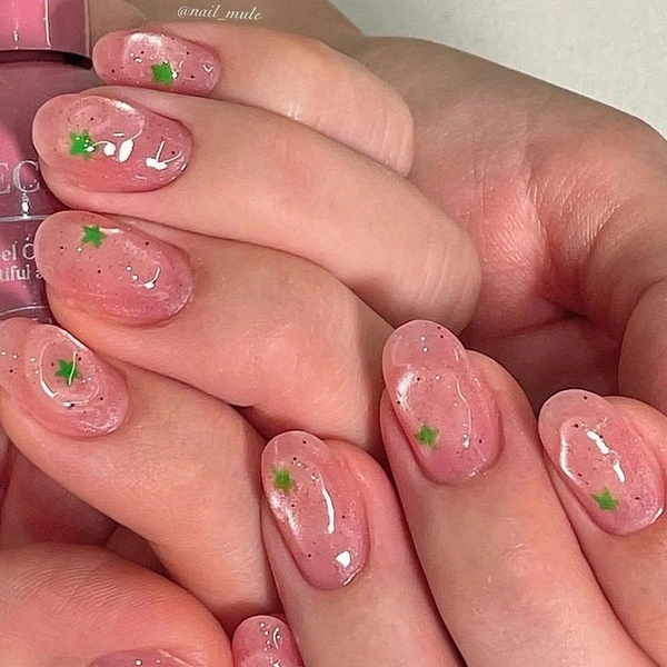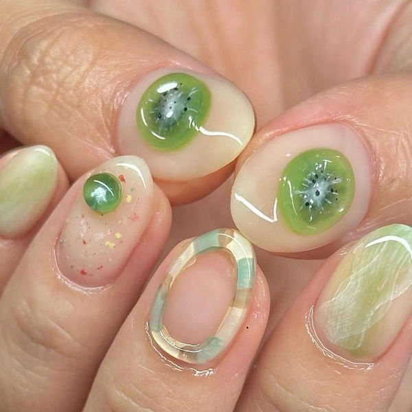 Киви можно и нарисовать, и просто использовать как источник вдохновения! Для этого тебе нужно покрыть ногти зеленым лаком в акварельной технике, добавить разноцветных блесток и объемные элементы. Главное — сохранить правильный оттенок этого фрукта!