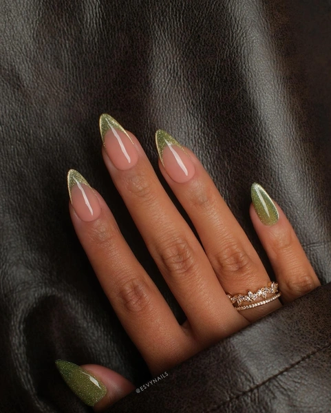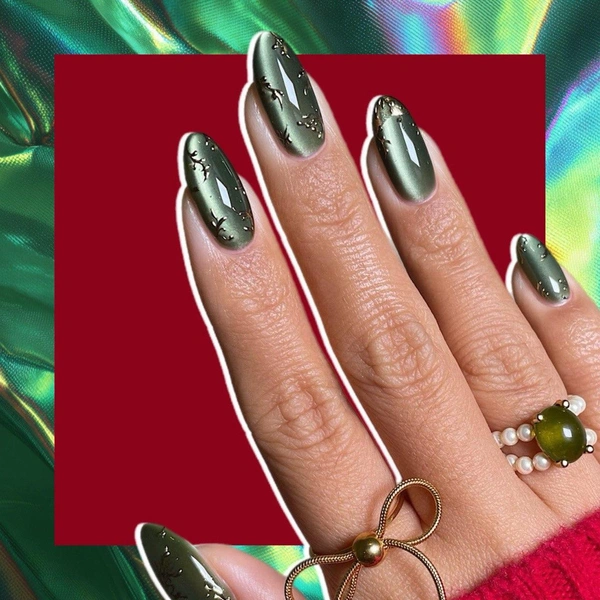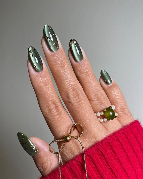 Оливковый — самый базовый оттенок этого года. Он может показаться скучным, но на самом деле он сочетается буквально с любыми цветами и аутфитами. Просто добавь в маникюр несколько деталей. Например, золотых бабочек. Их можно нарисовать тонким слоем 3D-геля, а после добавить акцентный шиммер для яркости. Осталось покрыть топом и дать подружкам полюбоваться своим новым необычным нейл-артом!