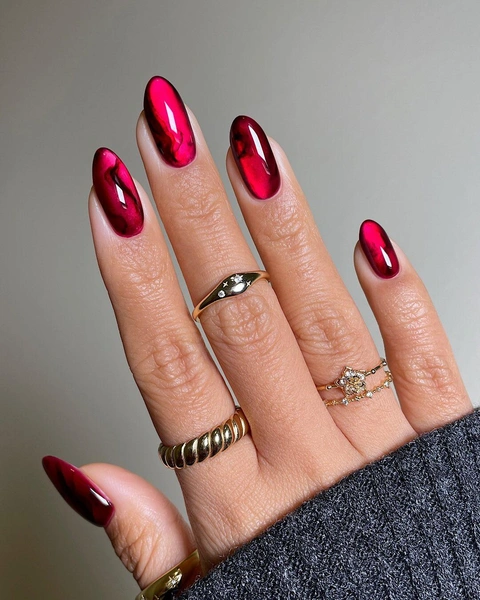 Готика не планирует покидать главные хит-парады нейл-арта. Я подобрала для тебя крутую идею в виде винного маникюра с вайбом фильма «Дракула». Вся особенность кроется не только в глубоком оттенке, но и в ярких деталях, будто на твоих ногтях рассыпался темный туман. Его можно повторить с помощью тонкой кисти и небольшого количества воды, чтобы эффект был более естественным. Не забудь про магнит для сияющих бликов!