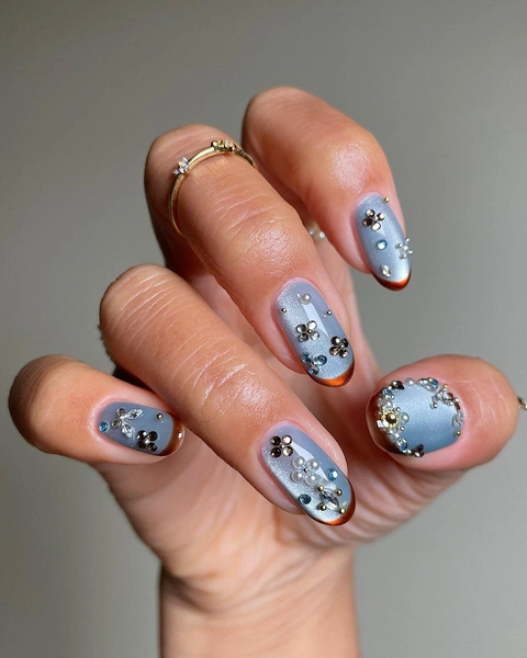 Одна из самых популярных вариаций маникюра с эффектом cat eye — френч. Но я нашла не простую идею, а с яркими стразами: в новый год нужно входить красиво. Небесный и медный выглядят очень комплиментарно вместе! Осталось только вооружиться тонкой кистью для французского нейл-арта: это не классическая линия, а более тонкая и аккуратная. Добавь несколько цветных страз и жемчужинок!