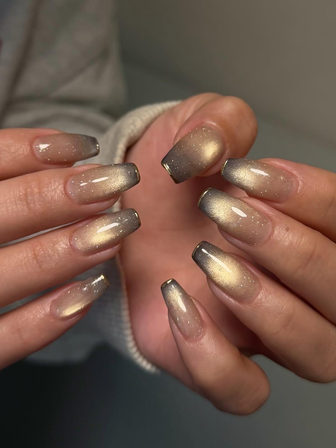Серый давно перестал быть скучным, а в паре с золотом он и вовсе выходит на новый уровень. Градиент от холодного светло-серого на кончиках к теплому металлическому золоту у кутикулы выглядит одновременно современно и элегантно. Такой маникюр отлично вписывается в зимний гардероб с его монохромными образами, поэтому самое время его повторять!