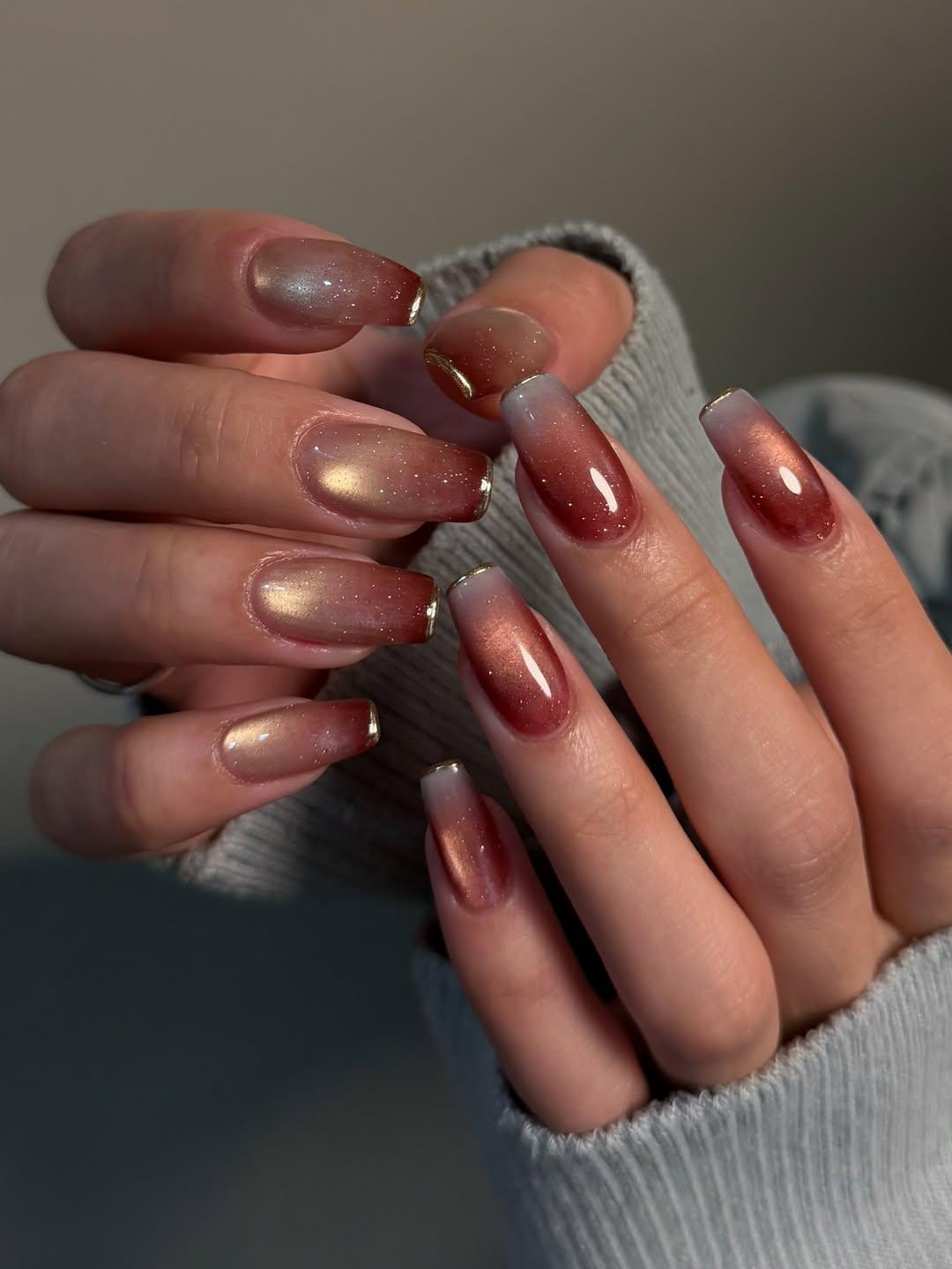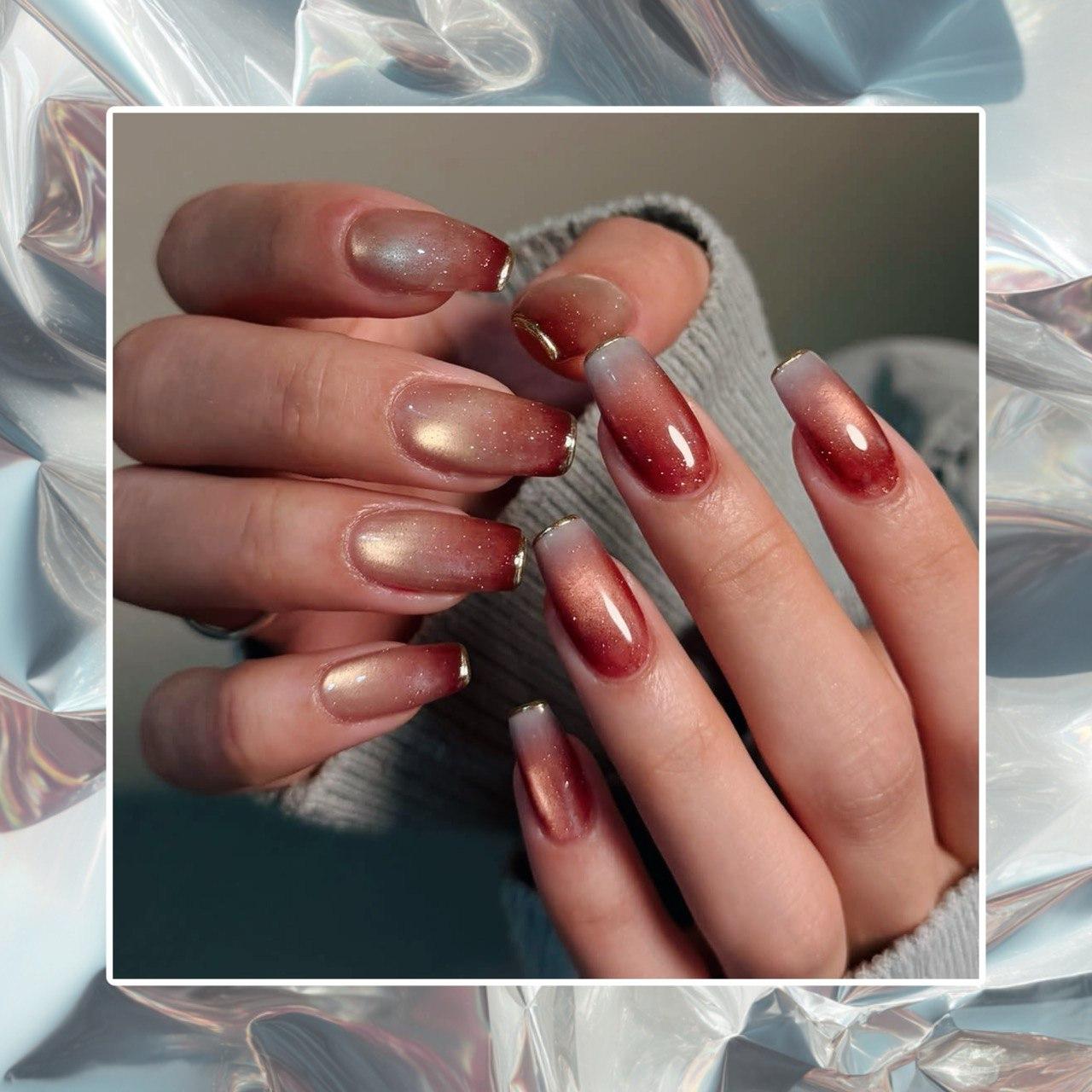 Если зимой хочется магии, то градиент, усиленный магнитным эффектом «кошачий глаз», станет идеальным маникюром для тебя. В нем оттенки меняются в зависимости от угла и освещения, так что скучным такой дизайн точно не назовешь. В качестве базы выбирай золотисто-красный цвет, а на кончики нанеси голубой лак с серым подтоном. Если хочешь, то золотую линию френча тоже смело добавляй.