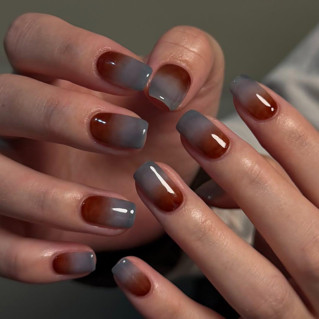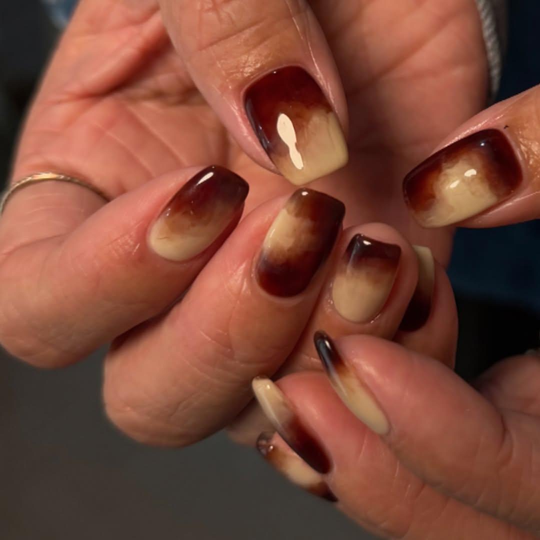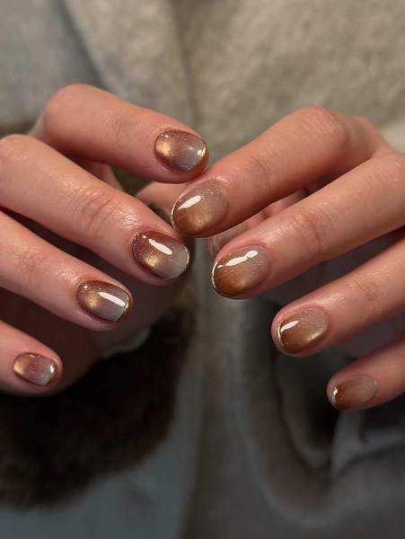 Теплый и уютный вариант маникюра для зимы — градиент в молочно-кофейной гамме. Здесь встречаются оттенки сливок и кофе: будто бы ты наливаешь молоко в американо. Переходы максимально плавные, без резких контрастов, но с нежным акварельным переходом.
