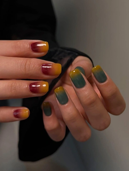 На фоне холодных зимних оттенков теплые градиенты становятся настоящим визуальным антидепрессантом. Сочетай на ногтях сразу несколько ярких цветов: красный с оранжевым и лаймовый с голубым. Это градиент для тех, кто даже зимой не готов переходить на скучные темные цвета или полный нюд.
