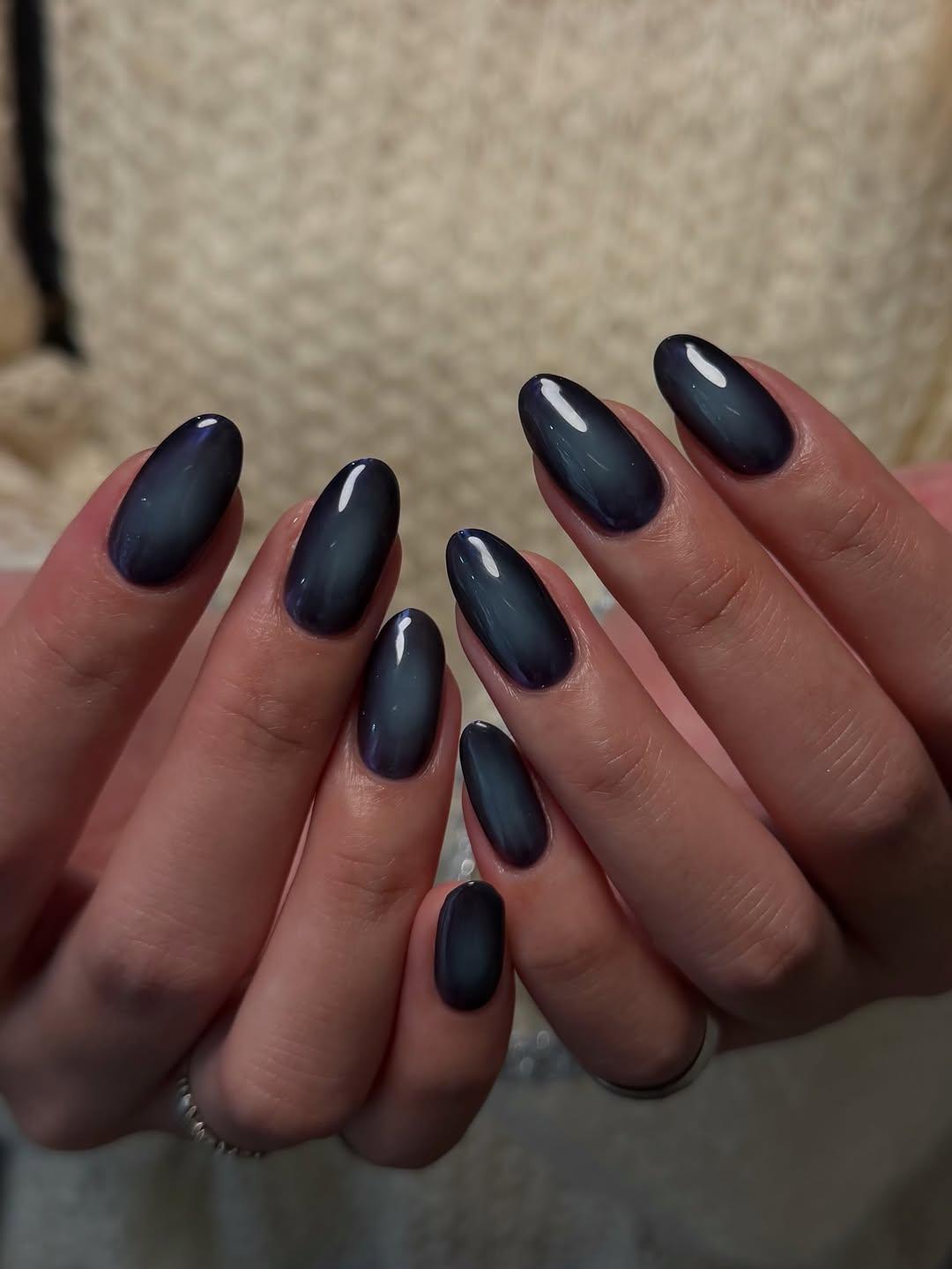 Аура-маникюр продолжает удерживать позиции, но зимой 2026 он уходит в холодную, воздушную сторону. Голубая аура — это мягкое свечение в центре ногтя, которое будто подсвечивает его изнутри. Рисуй ее на темной базе коричневого или бордового цвета. Ногти будут выглядеть просто роскошно!