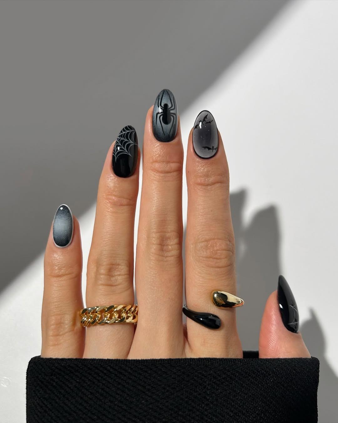 Черный — самый подходящий цвет для Хэллоуина. Если не хочешь подбирать сложный наряд, можно просто нарядиться в черное платье и говорить всем, что ты ведьма. В маникюре тоже можно использовать лишь его. А украсить и разнообразить дизайн советую пауками. Нарисуй тонкую белую паутину или тень пугающего тарантула.