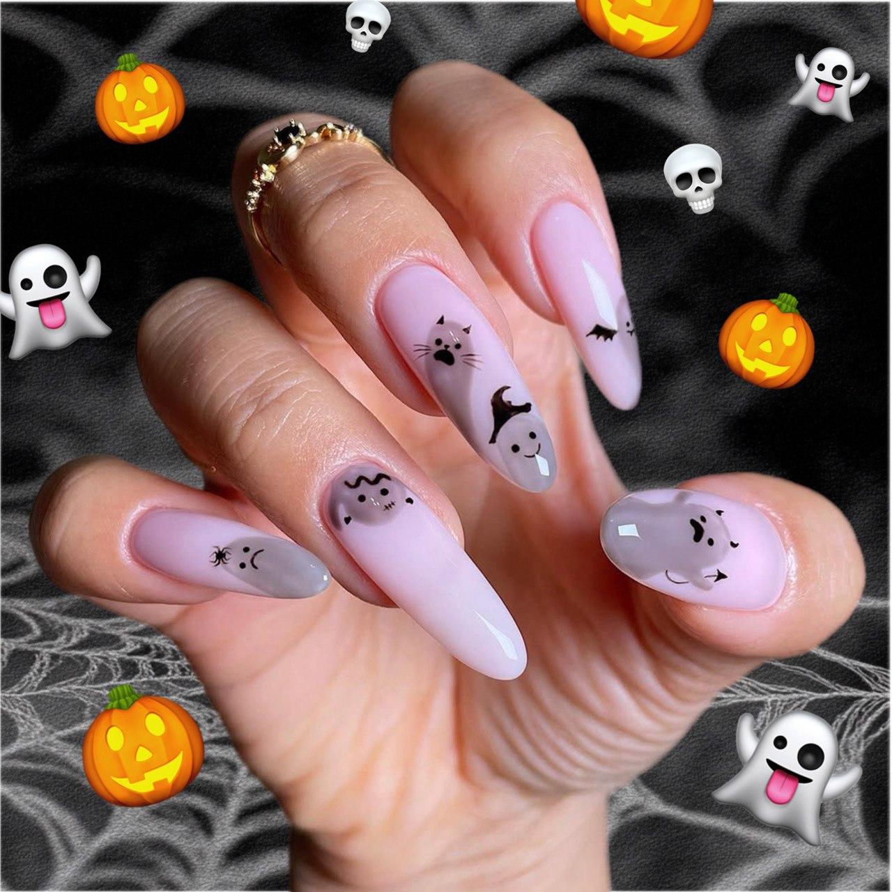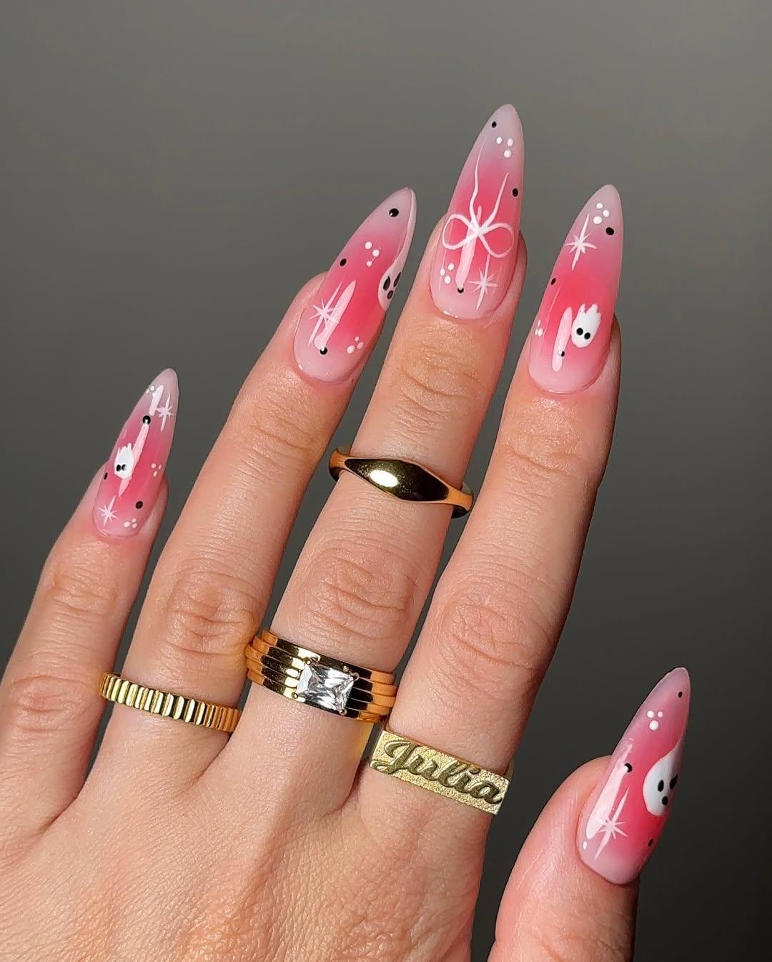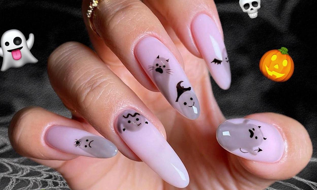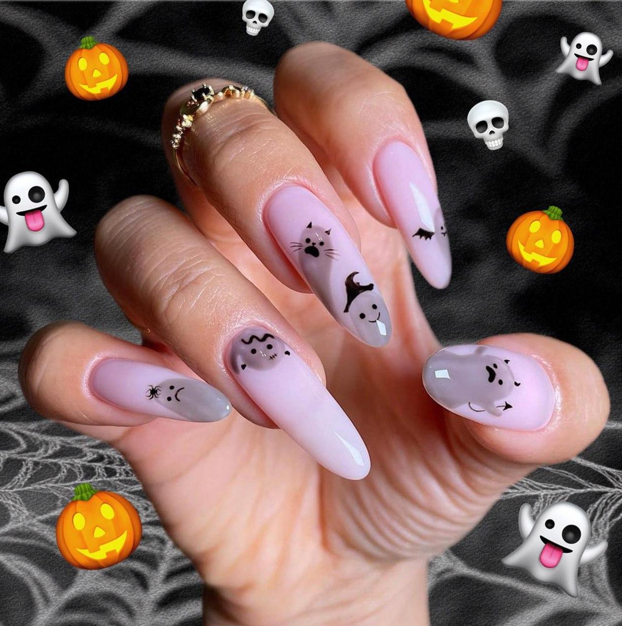 Кто сказал, что маникюр на Хэллоуин обязательно должен быть устрашающим и темным? Розовый маникюр с аурой отлично подойдет тем, кто не планирует отходить от нежных оттенков, но все же хочет добавить милых привидений.