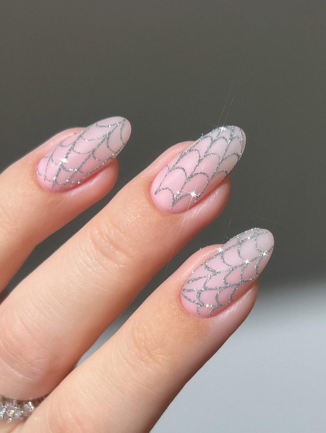 К продолжению темы о нежных маникюрах на Хэллоуин, я нашла идеальное сочетание — молочно-розовая матовая база и сияющая паутина. Такой нейл-арт очень легок в исполнении — тебе нужно нарисовать несколько линий серебряным цветом, имитирующих паутину. Главное — использовать самую тонкую кисть в твоем арсенале. Можешь также использовать лак с блестками, если хочешь более яркого сияния.