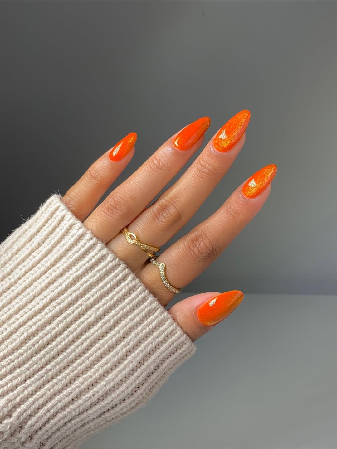 Для его повторения тебе нужен неоновый оранжевый лак с магнитным эффектом. Лучше найти такой, в котором блестки переливаются золотым. На твоих ногтях будет красивый перелив, напоминающий солнечный блик на кружке теплого латте с корицей.