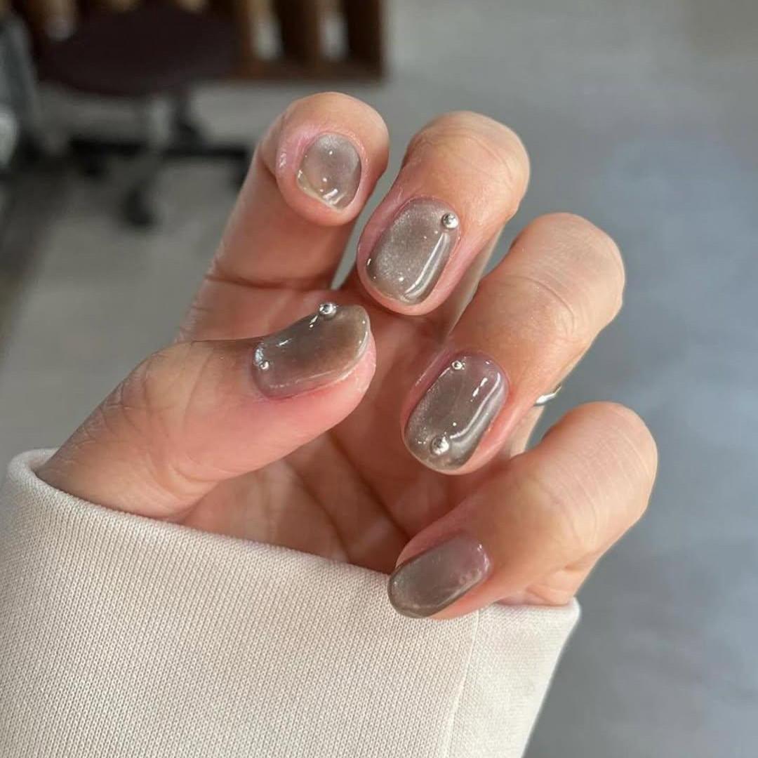 В этом дизайне главную роль играет покрытие с эффектом «кошачий глаз». Выбирай оттенок в светлой или серо-серебристой гамме, а потом обрабатывай магнитом каждый ноготь, чтобы создать красивые блики. В конце укрась ногти стразами или блестками.