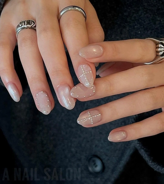 Очень классно смотрится маникюр, в котором из страз или бульонок выложены рисунки. Например, простые крестики. Еще один способ разнообразить дизайн — сделать рамку из страз. Получится очень красиво и нежно, но не скучно при этом!