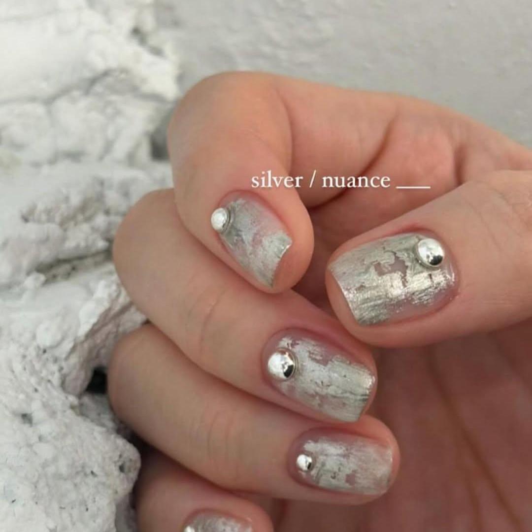 В этом дизайне не никакой аккуратности! Бери серо-серебристый плотный лак, хорошенько сними большую часть средства с кисточки и рисуй ей мазки. Получится что-то типа узора штукатурки. А затем украшай каждый ноготь большими серебряными стразами. Получится очень современно!