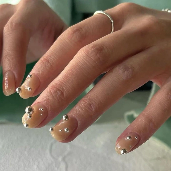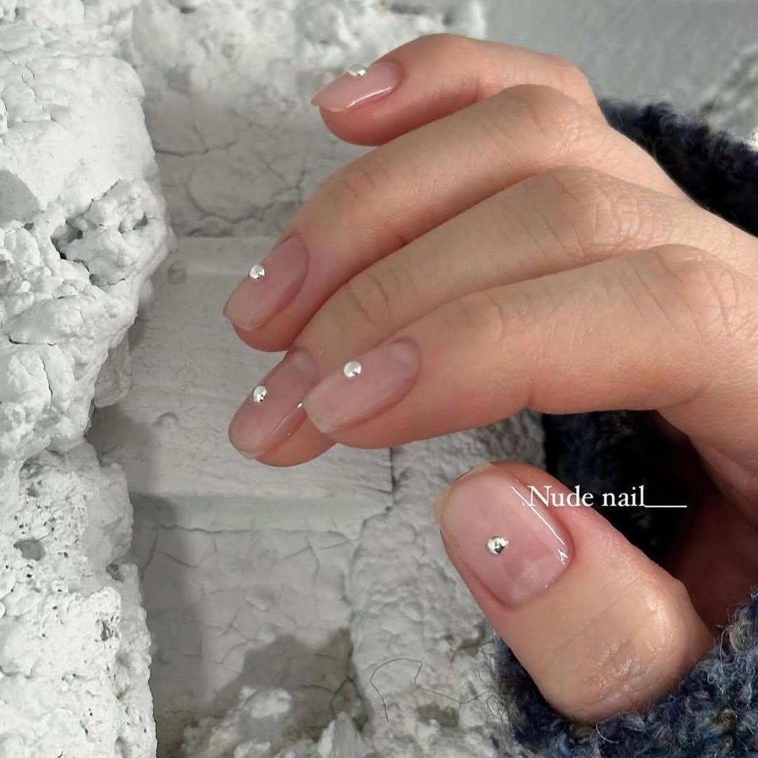 Этот маникюр вновь похож на предыдущий, но тут тебе понадобятся крупные стразы. Опять подготовь ногти, покрой базой и любимым нюдовым лаком, а потом украшай кристаллами разного размера. Кстати, можешь заменить их на бульонки или серебристые шарики.