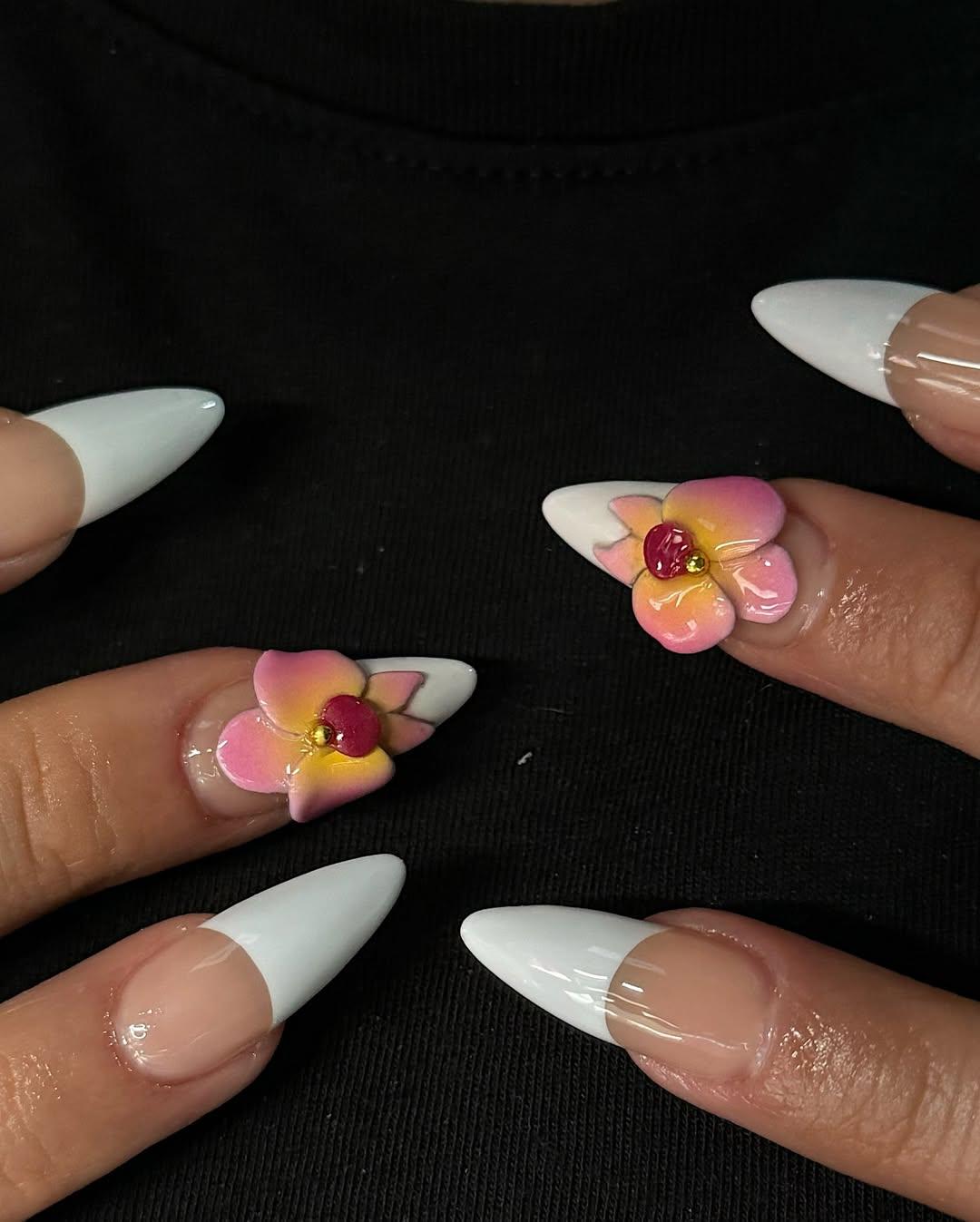 Хочется чего-то попроще, но не менее эффектного? Тогда добавь объема: даже простой маникюр с белыми кончиками, украшенными прозрачным гелем, выглядит уже круто. Дополни такой дизайн втиркой, градиентом-аурой и небольшим количеством страз. Или добавь крупные объемные элементы — цветы, например. С ними по-новому заиграет и френч, и однотон.