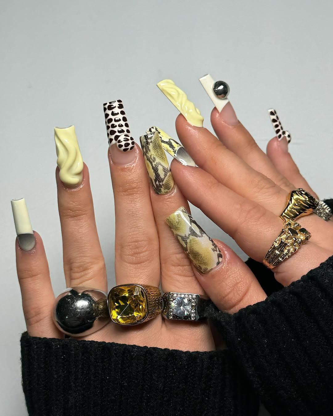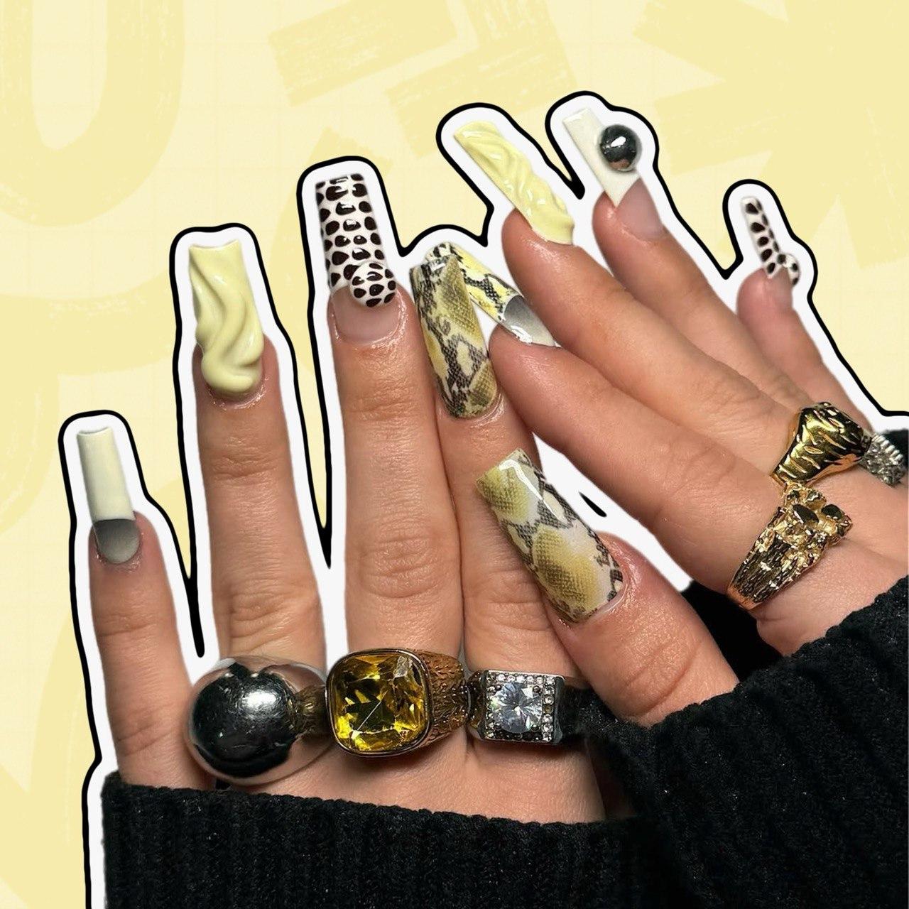 А вообще фанаткам сливочного желтого можно сделать сразу кучу разных маникюров. Тут тебе и френч, и объемы, и градиент, даже покрытие, напоминающее змеиную кожу. Все это прекрасно смотрится с пастельным оттенком. Если хочешь, добавь серебряные 3D-элементы, которые добавят маникюру капельку футуристичности.