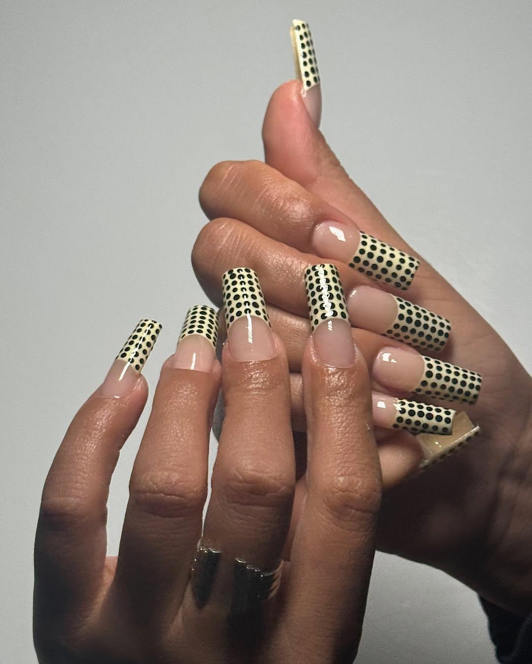 А если тебе нравится дизайн, в котором каждый палец украшен одним и тем же узором, то есть идея и для тебя. Начни с нюдовой базы и френча цвета сливочного масла. Конечно, ты можешь выбрать любой другой оттенок, но этот сочетает в себе актуальность и нежность. Потом нарисуй на каждом пальце черные точки. Готово! Это прикольно и достаточно необычно, но времени займет мало.
